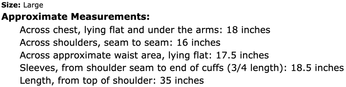 Sleeves, from shoulder seam to end of cuffs (3/4 length): 18.5 inches