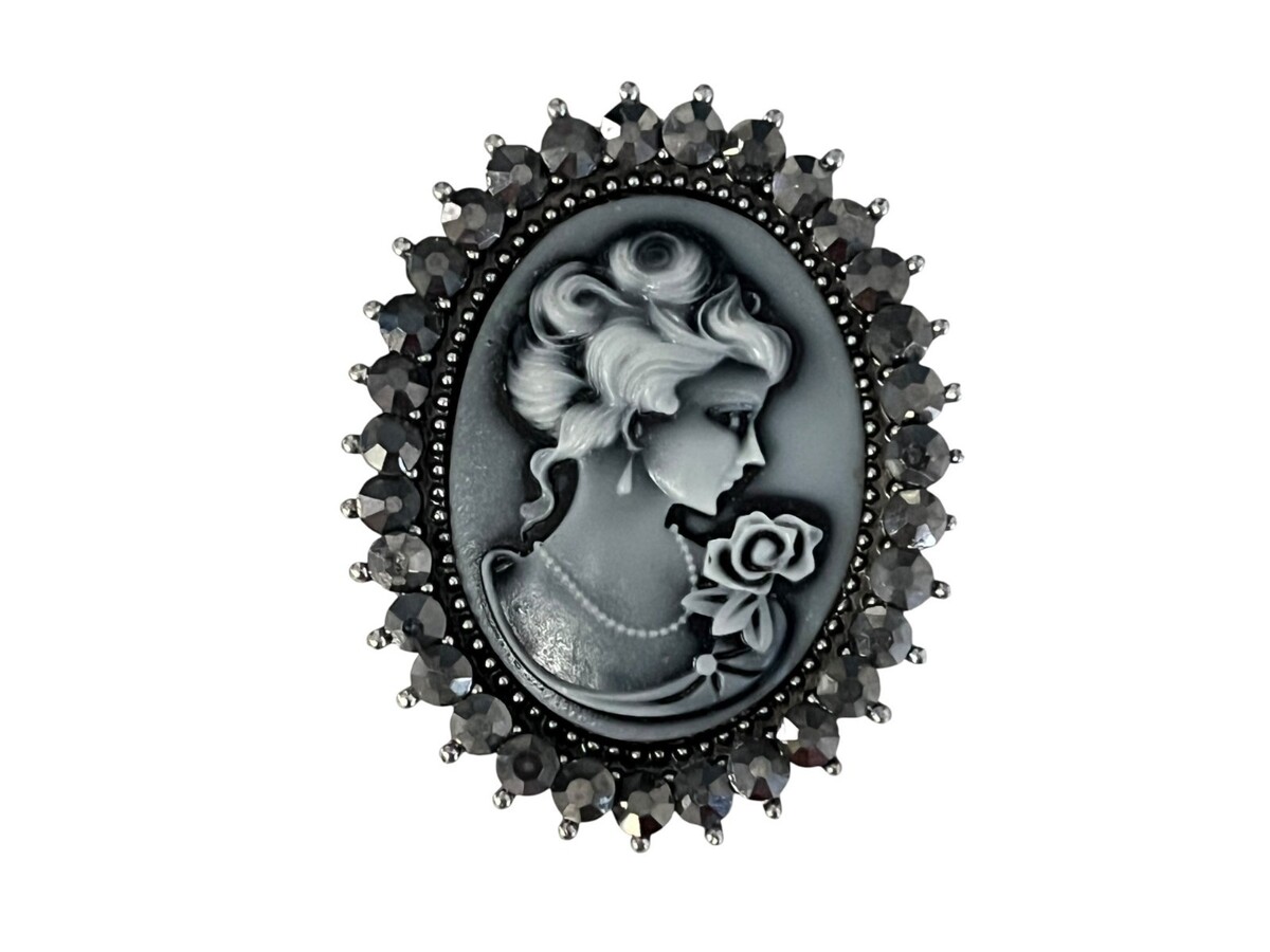 Vintage cameo-style brooch featuring a classic lady profile with delicate detailing and a rose accent. The black and gray cameo is framed by faceted dark rhinestones in a silver-tone setting, giving the piece a timeless Victorian-inspired look. A beautiful accessory for jackets, scarves, or dresses with vintage charm.