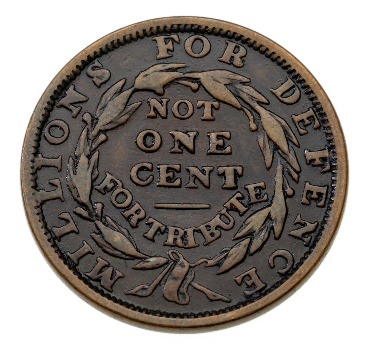 1841 Hard Times Token Not One Cent, Millions For Defence, HT-58