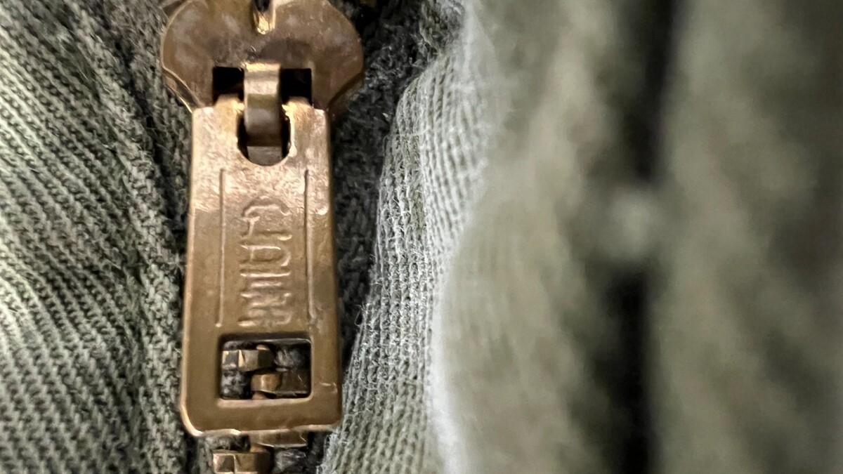 Fabric: 100% cotton twill · Green dye · Gusseted construction · Brass zipper · Tab/button waist
