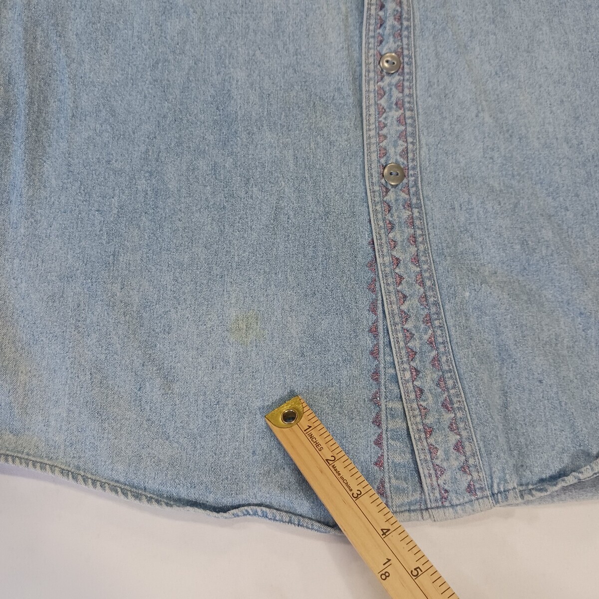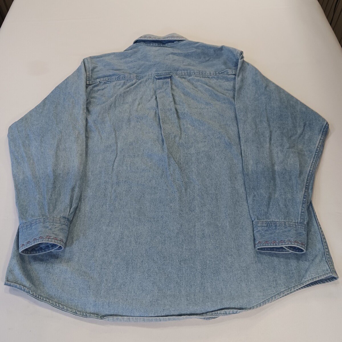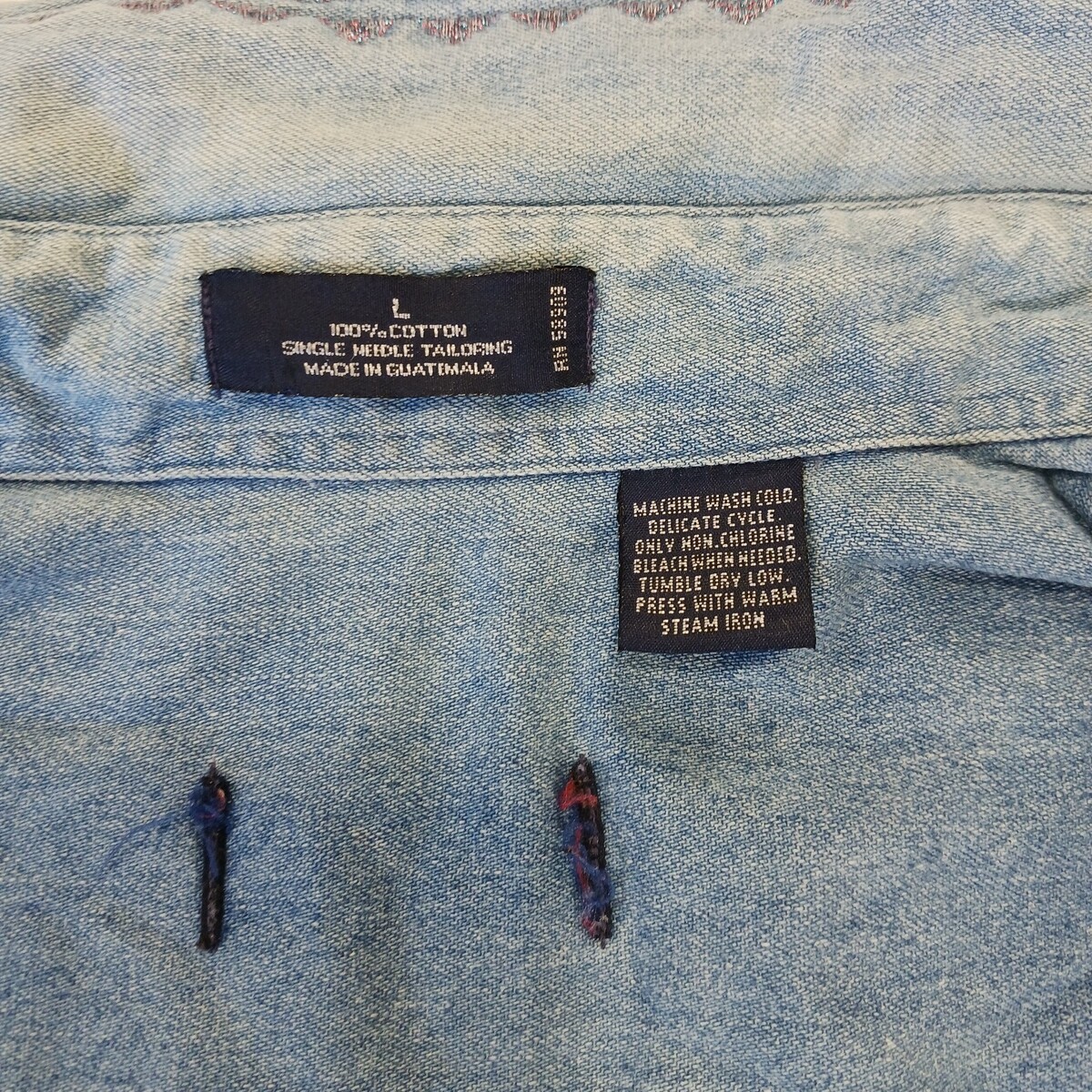 The Vintage Single Needle Tailoring RN#58909 Women's Cotton Blue Denim Shirt Size L is a classic piece with a solid pattern and long sleeves, featuring a button closure for a versatile style. Made from quality cotton denim fabric, this vintage shirt offers a regular fit and is in a timeless blue color, perfect for everyday wear. With a chest size of 50 inches and a size large, this shirt is a stylish addition to any wardrobe for those who appreciate classic, well-crafted attire. Made in Guatemala, this denim shirt is sure to make a statement with its vintage charm and quality craftsmanship.