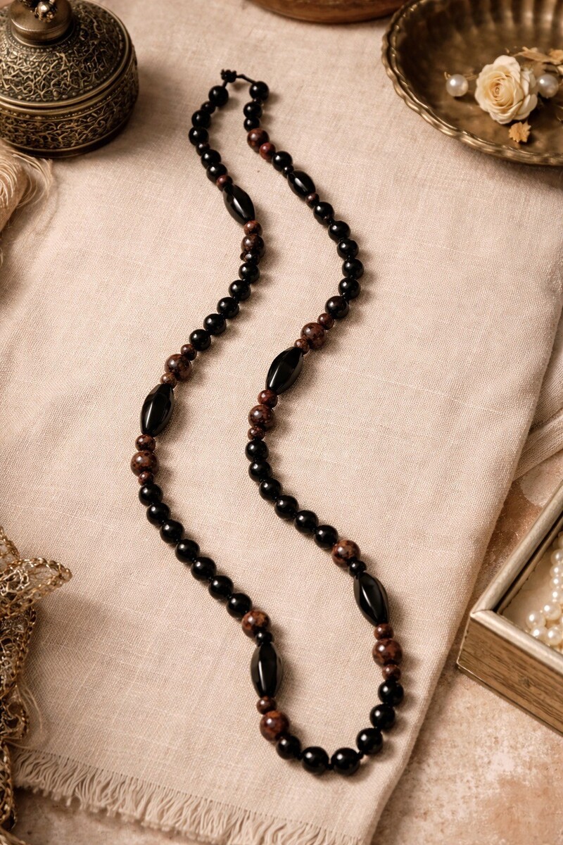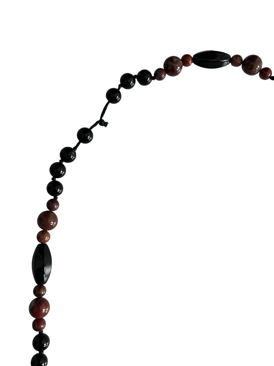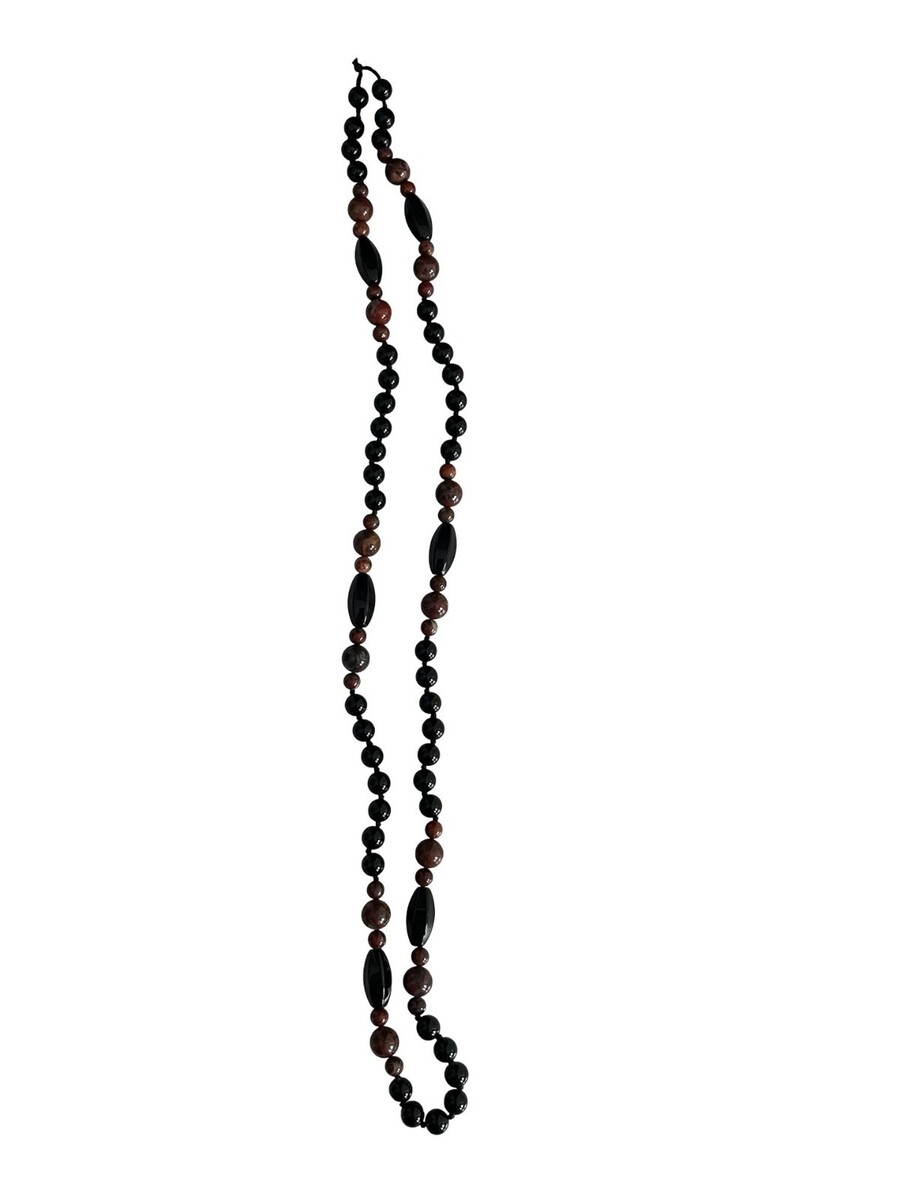 Vintage long beaded necklace featuring black and brown glass beads with a marbled stone-like appearance. The beads have a substantial weight and cool feel typical of glass. Designed with oval accent beads and knotted cord construction for a classic boho look. Easy slip-on style with no clasp.