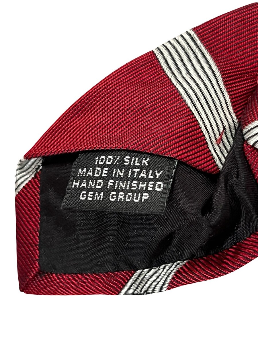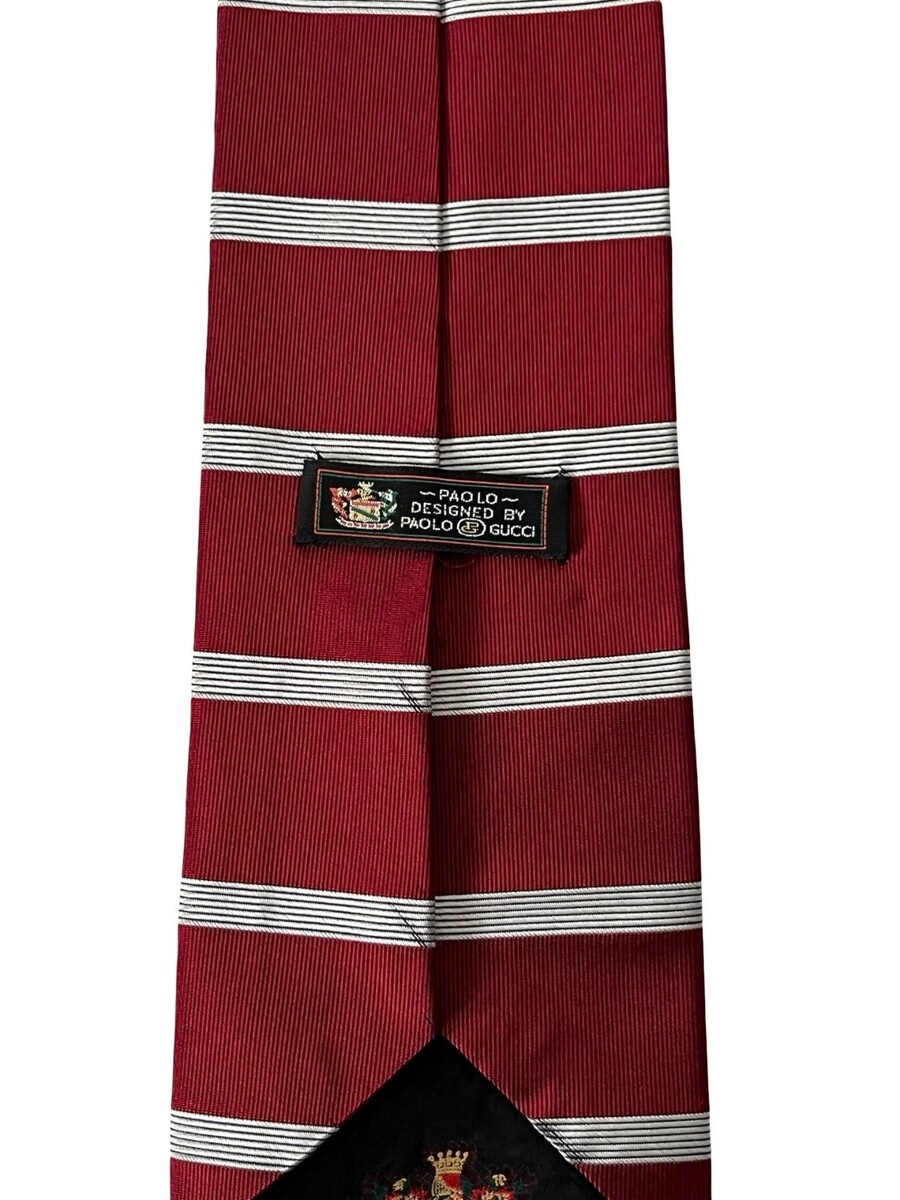 Vintage Paolo silk tie designed under the Gucci name, made in Italy. Features a rich red background with classic white stripe pattern. Crafted from 100% silk with a hand-finished construction, offering a timeless and sophisticated look for formal or business wear.