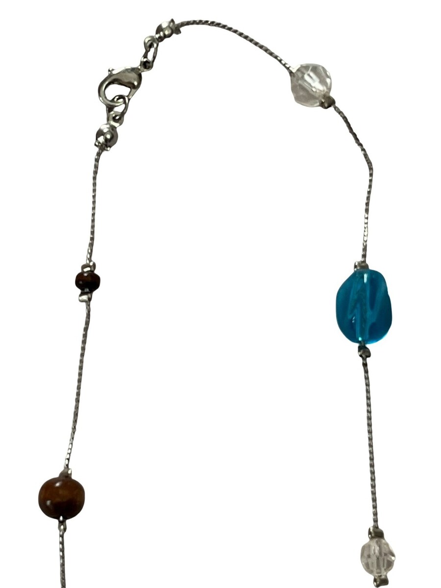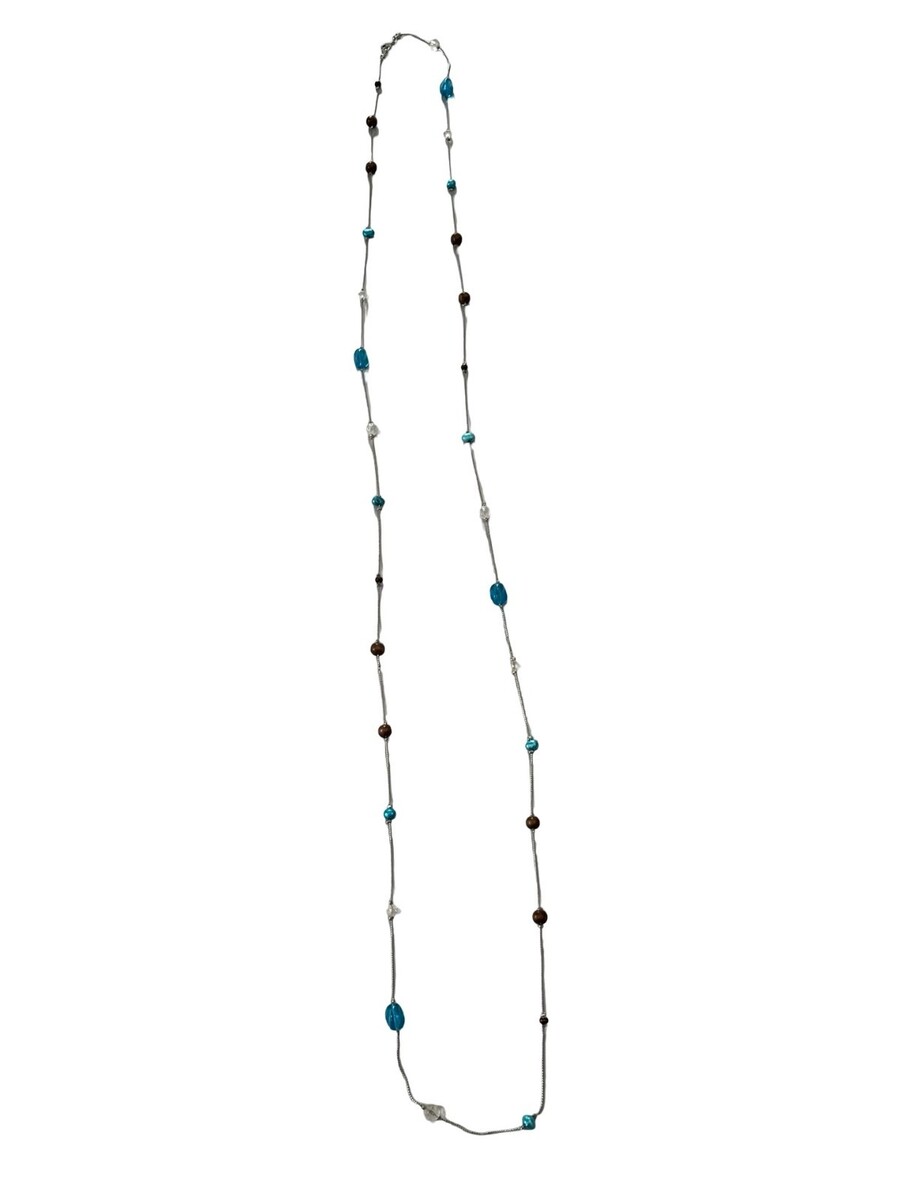 Long lightweight station necklace featuring a mix of blue glass, clear faceted beads, and brown round beads spaced along a silver tone chain. Extra-long 60 inch length allows for versatile styling?wear it long, doubled, or layered. Easy everyday piece with a soft boho Y2K feel.