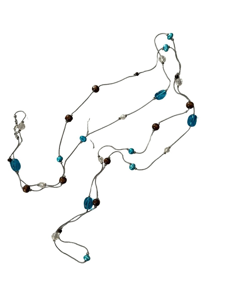 Long Beaded Necklace 60 Inch Silver Tone Blue Glass Brown Beads Station Style Y2K