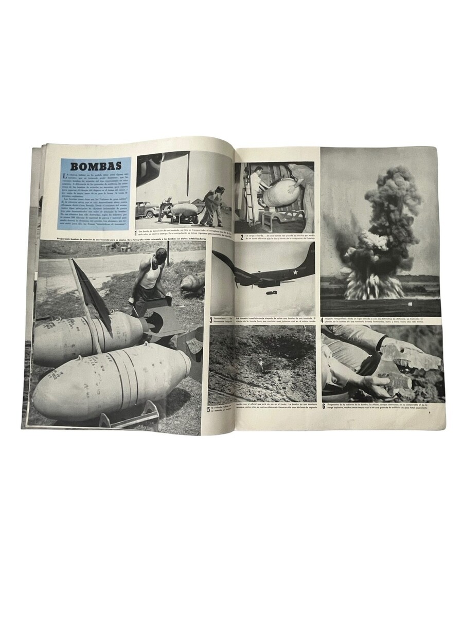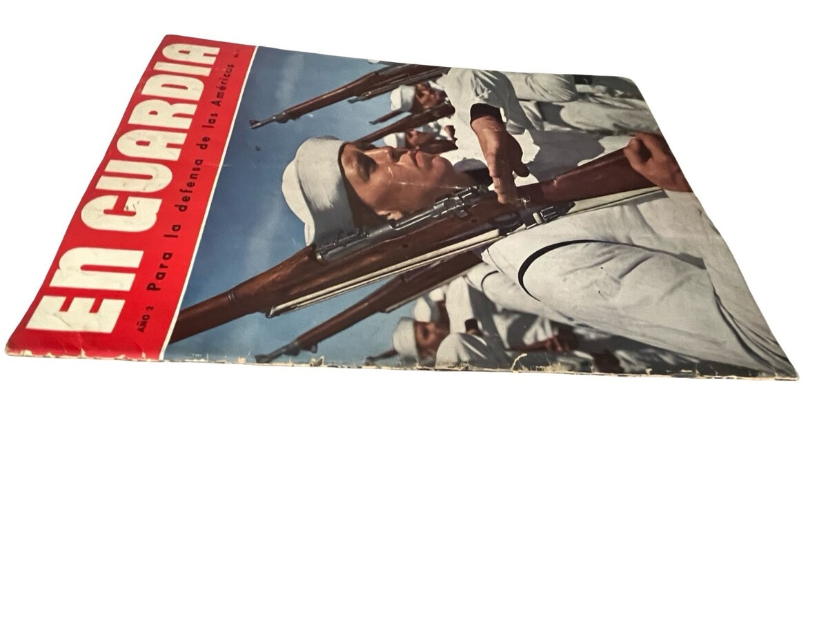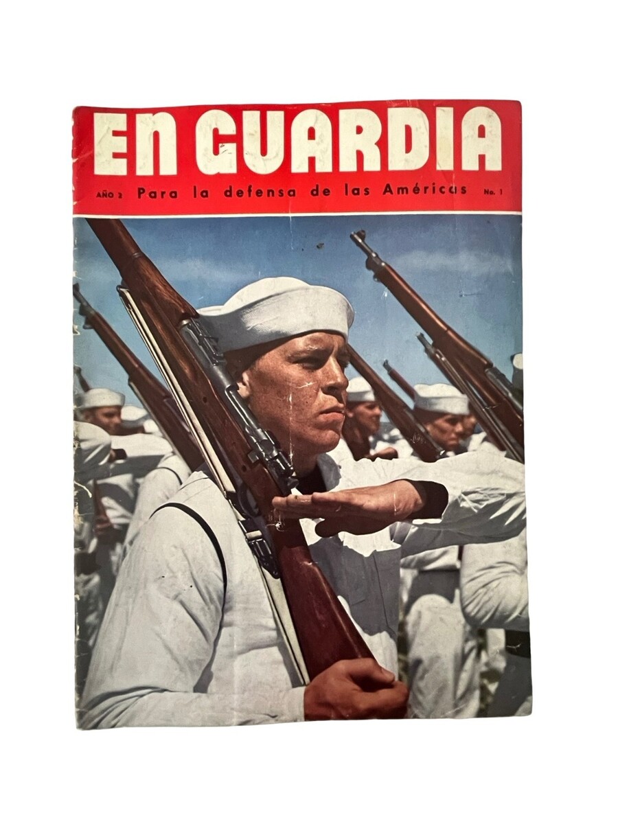 Original WWII-era issue of En Guardia, a Spanish-language magazine published to promote U.S. military efforts and influence across Latin America. This Año 2 No 1 issue features striking photography of soldiers, naval operations, aviation specialists, bomb production, and wartime activity. A powerful historical piece filled with dramatic imagery and period reporting from the 1940s.