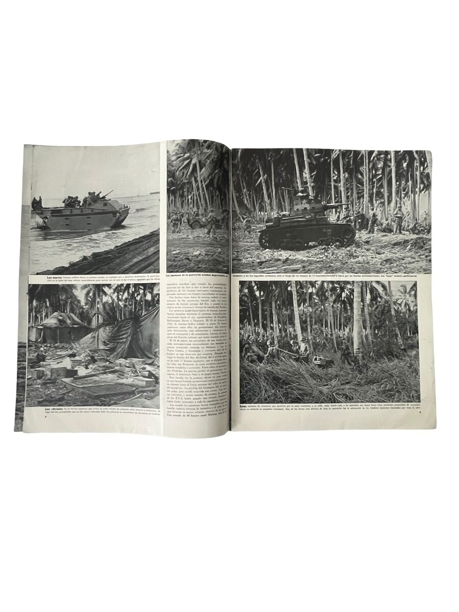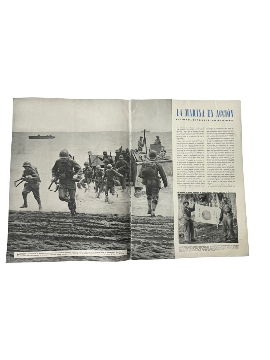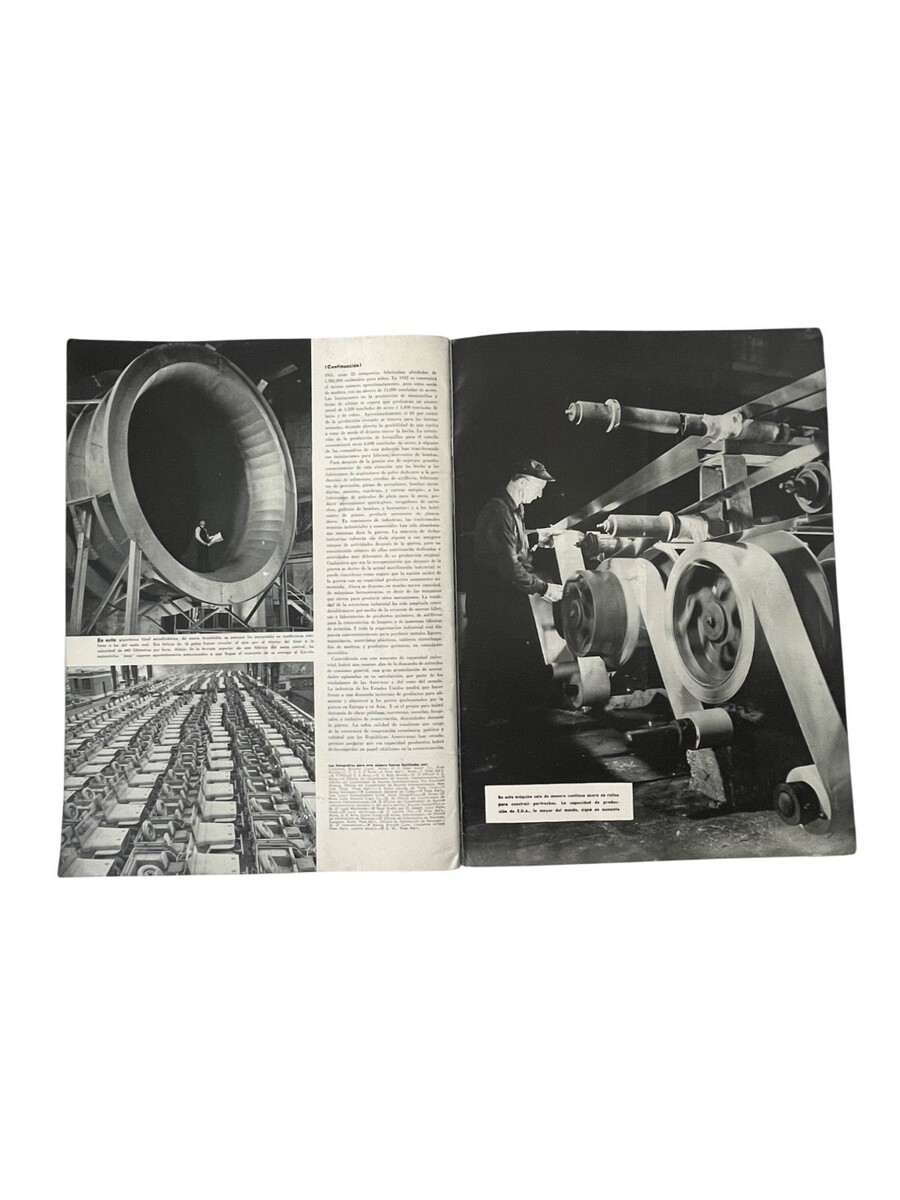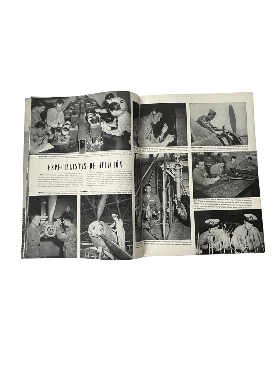 Original WWII-era issue of En Guardia, a Spanish-language magazine published to promote U.S. military efforts and influence across Latin America. This Año 2 No 1 issue features striking photography of soldiers, naval operations, aviation specialists, bomb production, and wartime activity. A powerful historical piece filled with dramatic imagery and period reporting from the 1940s.