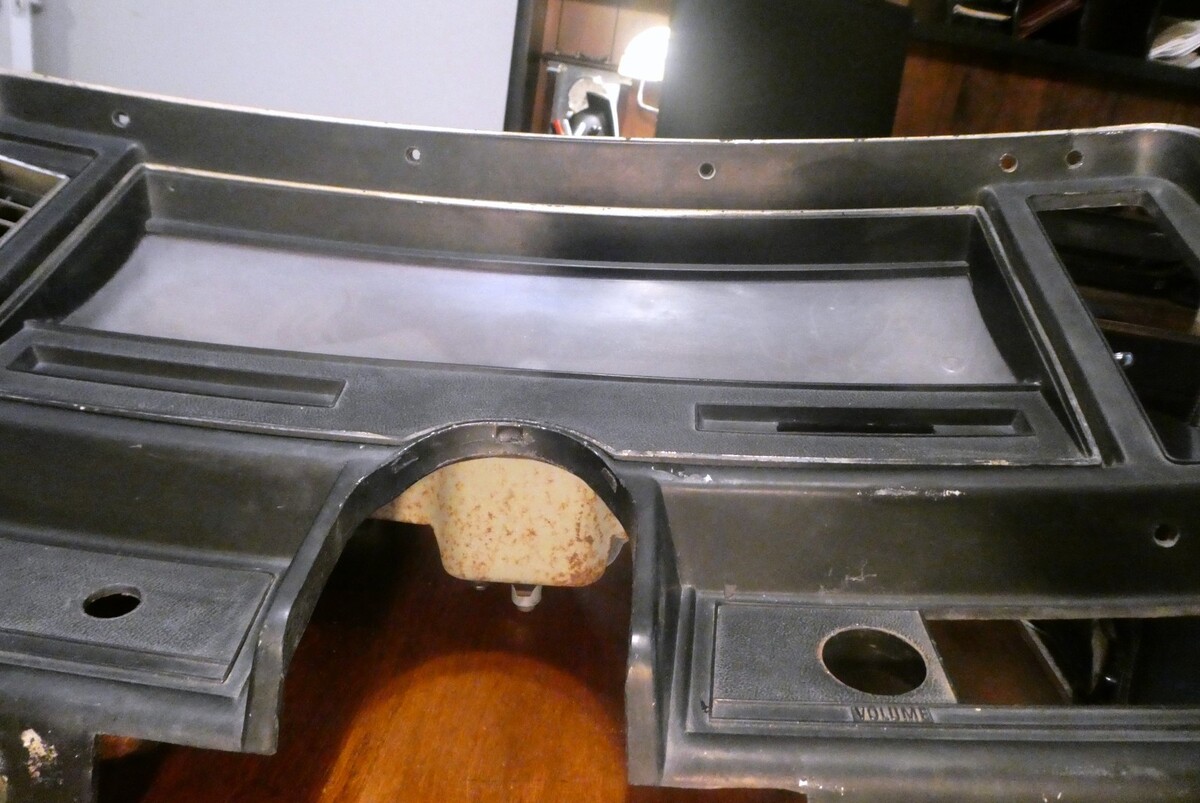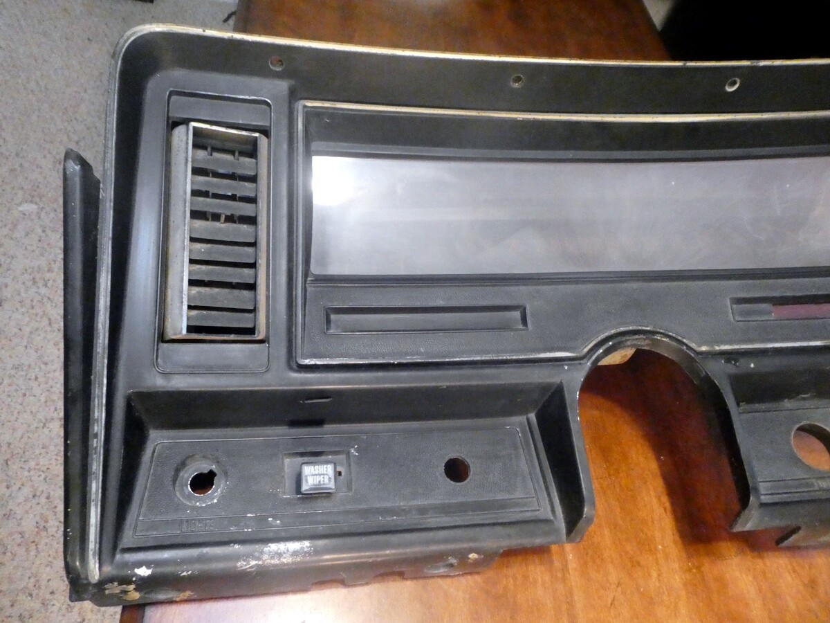 OEM 1969-1974 Chevy Nova Instrument Cluster with AC Dash Bezel Speedometer 6264721. Speedometer has been tested and works properly; Fuel gauge and wiper switch are untested so they may or may not work properly. radio mount is uncut, there is one small crack top right as shown in pictures, one of the plastic mounting boss has broken but is still attached to the screw as shown in pictures. Plastic lens is fogged. Gauge face has some surface rust and discoloration. Printed circuit board will need to be replaced. Metal gauge housing has some surface rust.