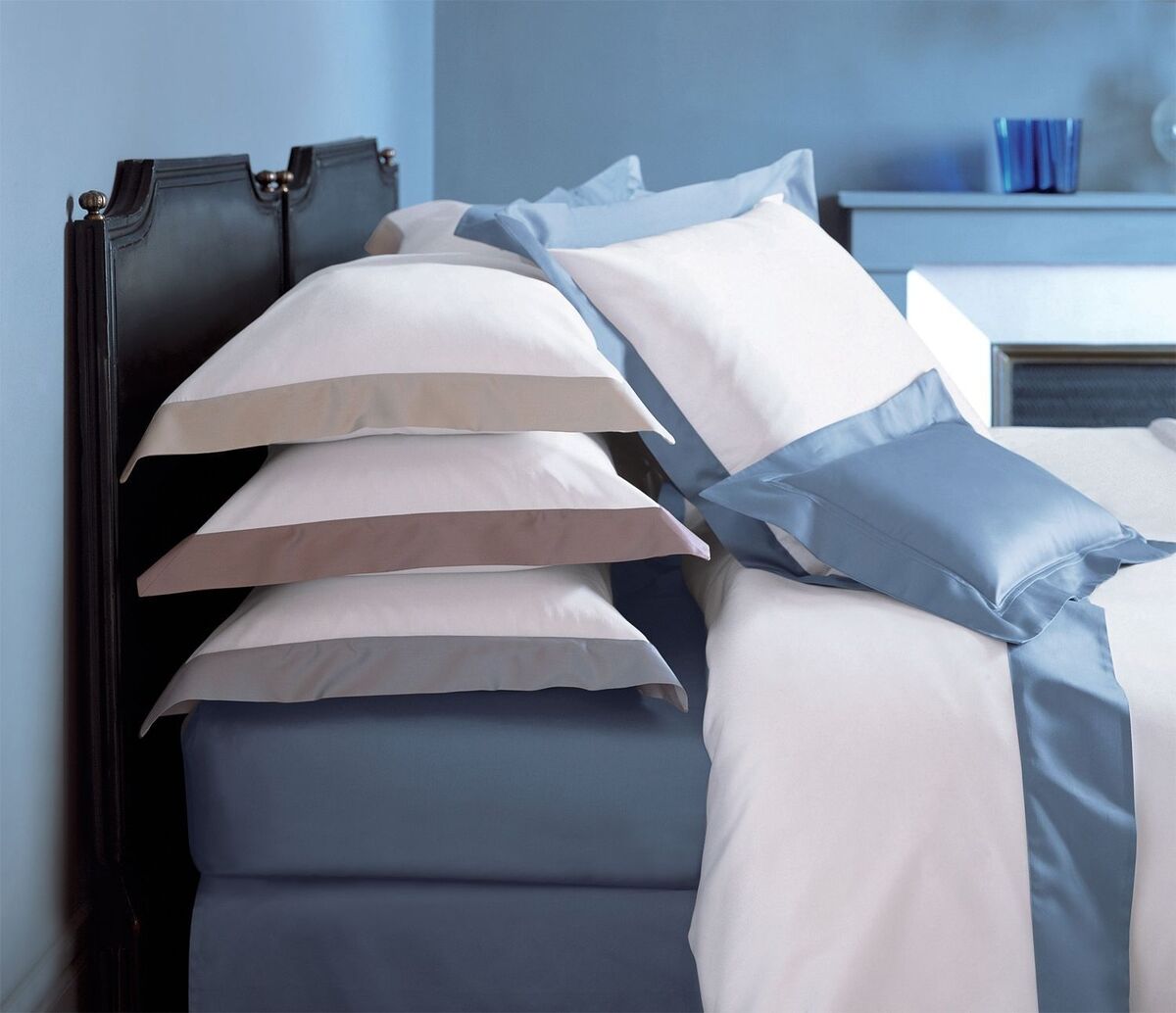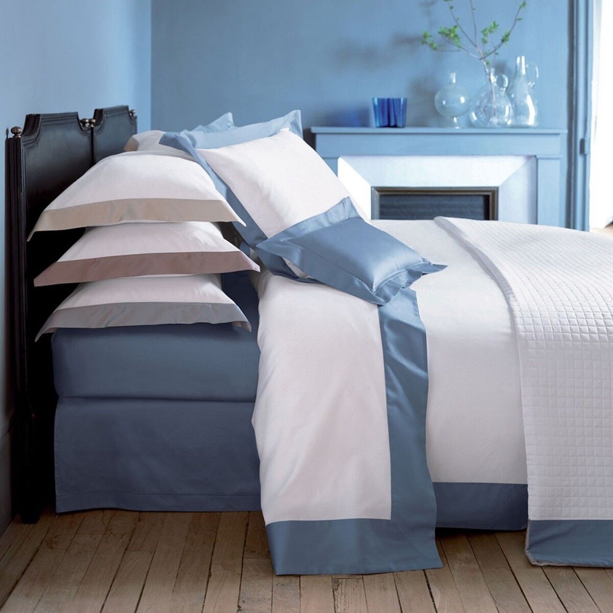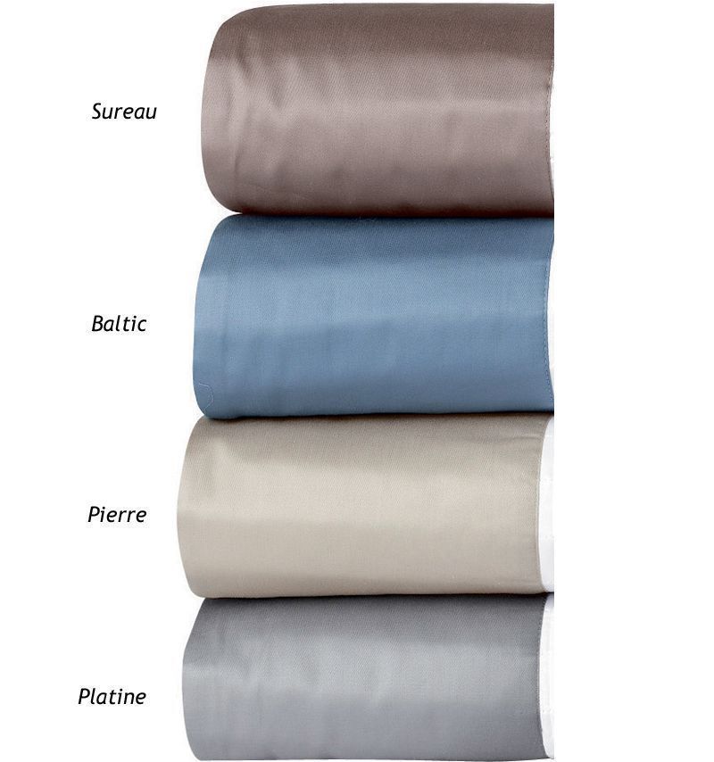 The Cocon bedding, from our 'Classic' collection, features luxurious Egyptian Cotton Sateen, in classic 'White', framed with a wide border in one of four rich colorways; Baltic (Blue), Pierre (Stone), Sureau (Taupe), or Platine (Platinum Grey). *Solid shams and fitted sheet shown in picture are 'Triomphe Baltic.'