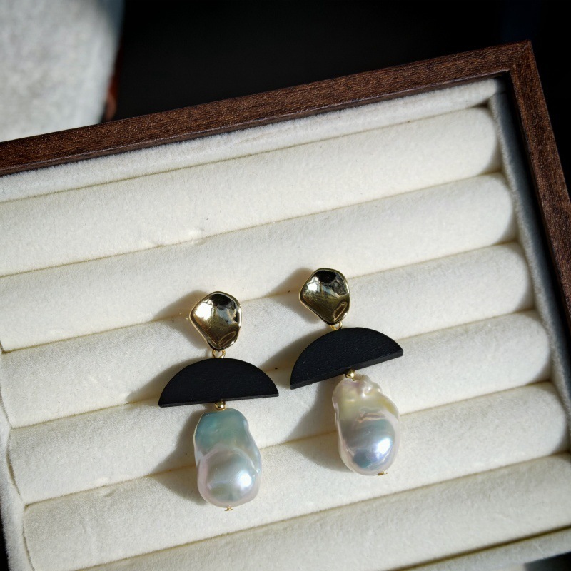 These minimalist drop earrings pair irregular baroque pearls with a sleek black semi-circular wood accent, set in polished gold-tone posts. The modern geometric design balances understated elegance and natural charm—perfect for elevating office looks, weekend brunches, or evening outings. Each pearl is one-of-a-kind, making every pair truly unique.