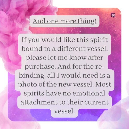 If you would like this vessel BOUND to you before arrival, please send your name and birthdate in a message. Being bound with a spirit will allow you to have a closer relationship and will increase their activity! This is something I offer free of charge, and I highly recommend the process!