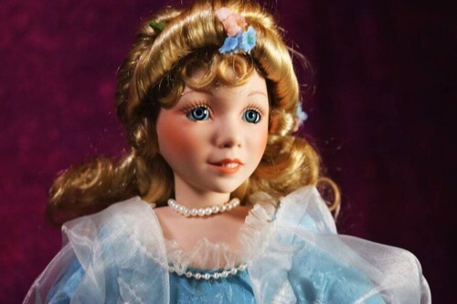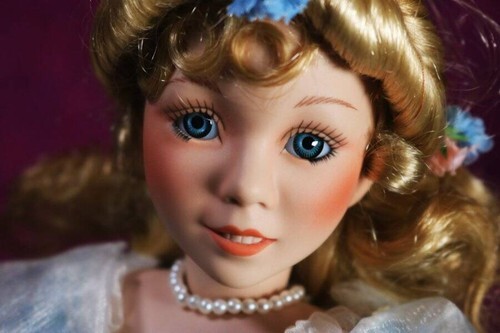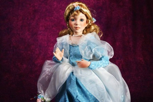 You will be receiving a gorgeous porcelain doll. Ivinikia is around 15-17 inches tall. Her body is stuffed and her head, neck, arms, and legs are made of porcelain. She has long, curly blonde hair decorated with flowers. She has sweet blue eyes. And she is wearing a long blue dress ribbons and flower accents.