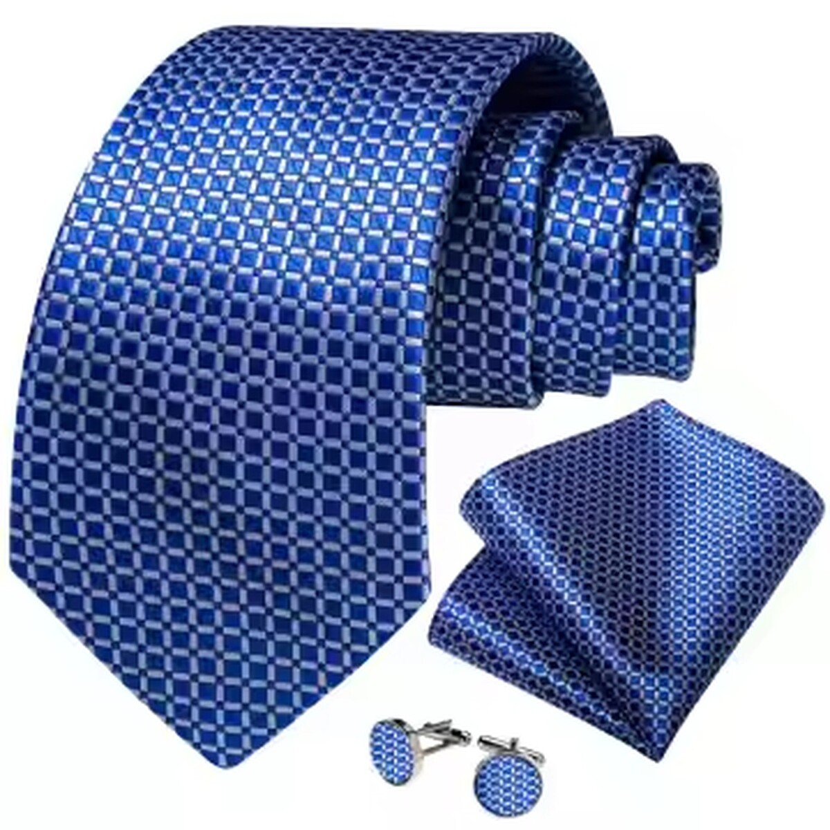 Royal Blue (Small Squares) Necktie Set (with Hanky and Cufflinks)