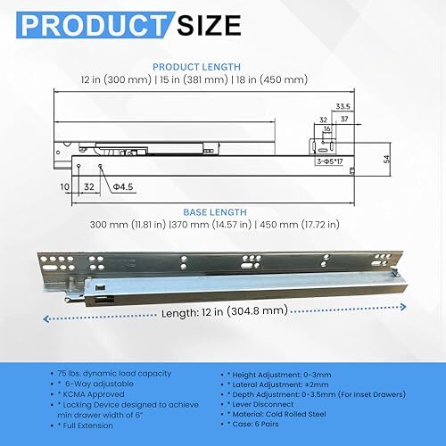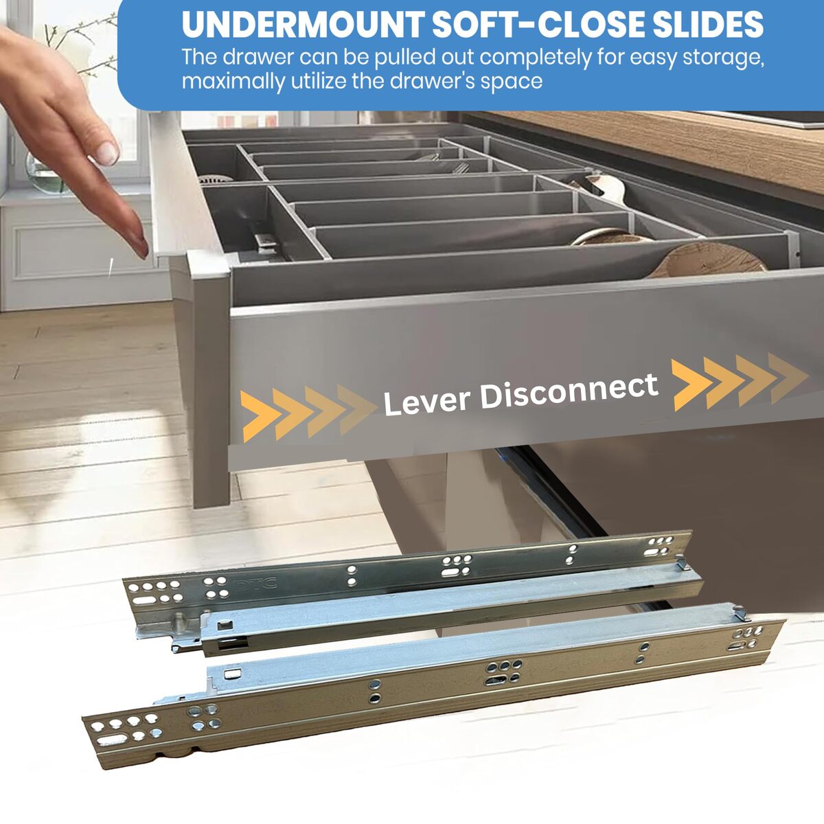Undermount Design: Hidden from view for a clean, modern aesthetic. Soft Close Mechanism: Ensures gentle, quiet closing to protect drawers and contents. Ball Bearing System: Provides smooth and effortless sliding action. Full Extension: Allows complete access to the drawer?s contents. Heavy-Duty Capacity: Supports up to 100 lbs, ideal for everyday use. 6-Way Adjustability: Offers precise alignment and easy installation. Cold Rolled Steel Construction: Ensures strength, durability, and resistance to wear.