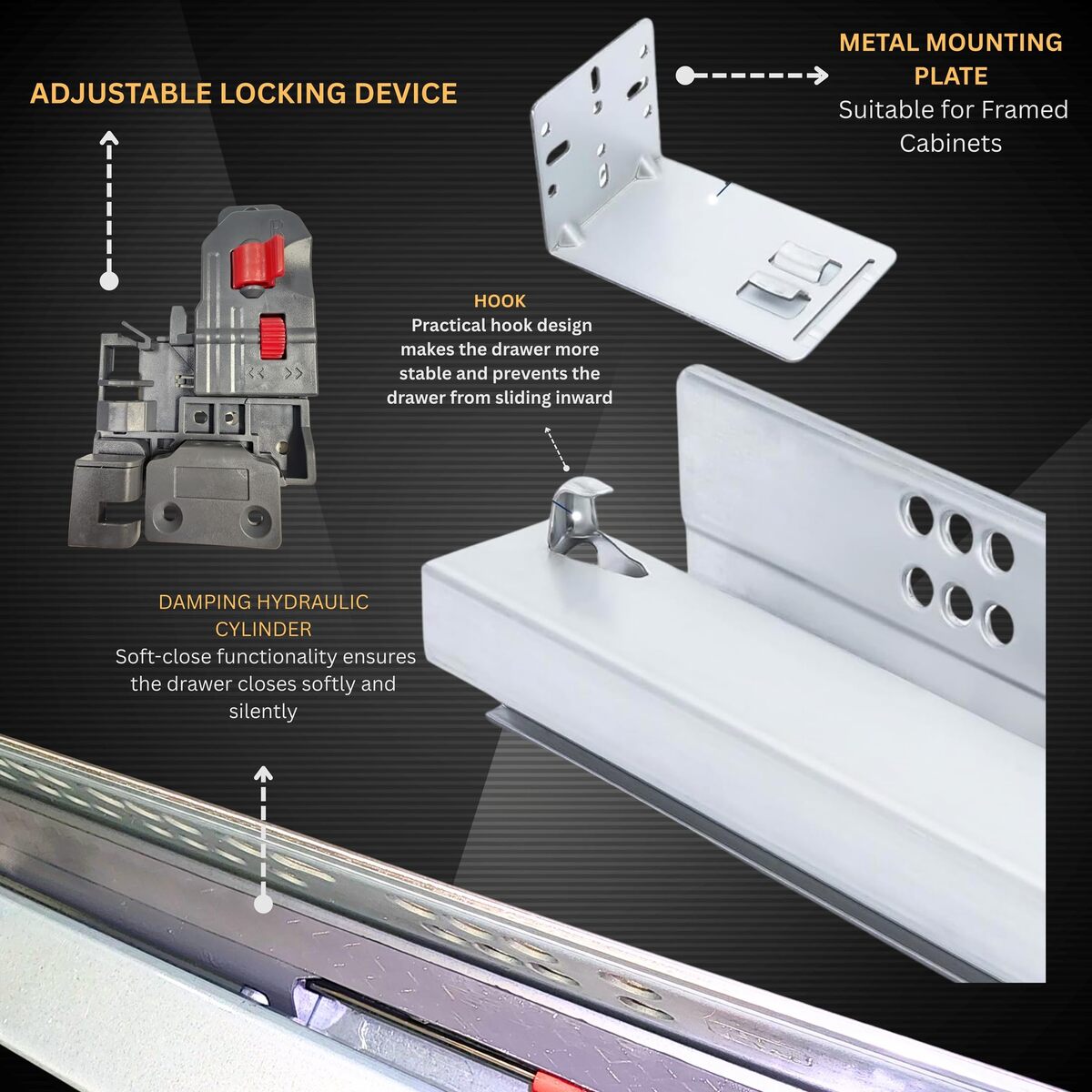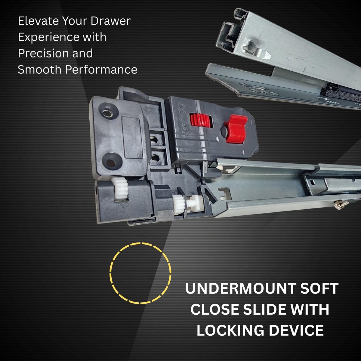 Product description: Transform your cabinetry with these premium undermount drawer slides engineered for superior performance and reliability. Featuring full extension capability, these concealed guides offer smooth, soft-close action and impressive 150-pound load capacity. The 6-way adjustability ensures precise alignment for a perfect fit, while the integrated locking device adds security. Crafted from durable cold rolled steel, these KCMA approved slides deliver professional-grade quality for your cabinet and furniture projects. Perfect for kitchen cabinets, wardrobes, and custom furniture pieces where seamless operation and hidden hardware are desired. The undermount design creates a clean look while maximizing drawer space. Installation is straightforward with multiple adjustment points for fine-tuning drawer positioning. These slides combine functionality with refined operation, making them an excellent choice for both new installations and cabinet upgrades.