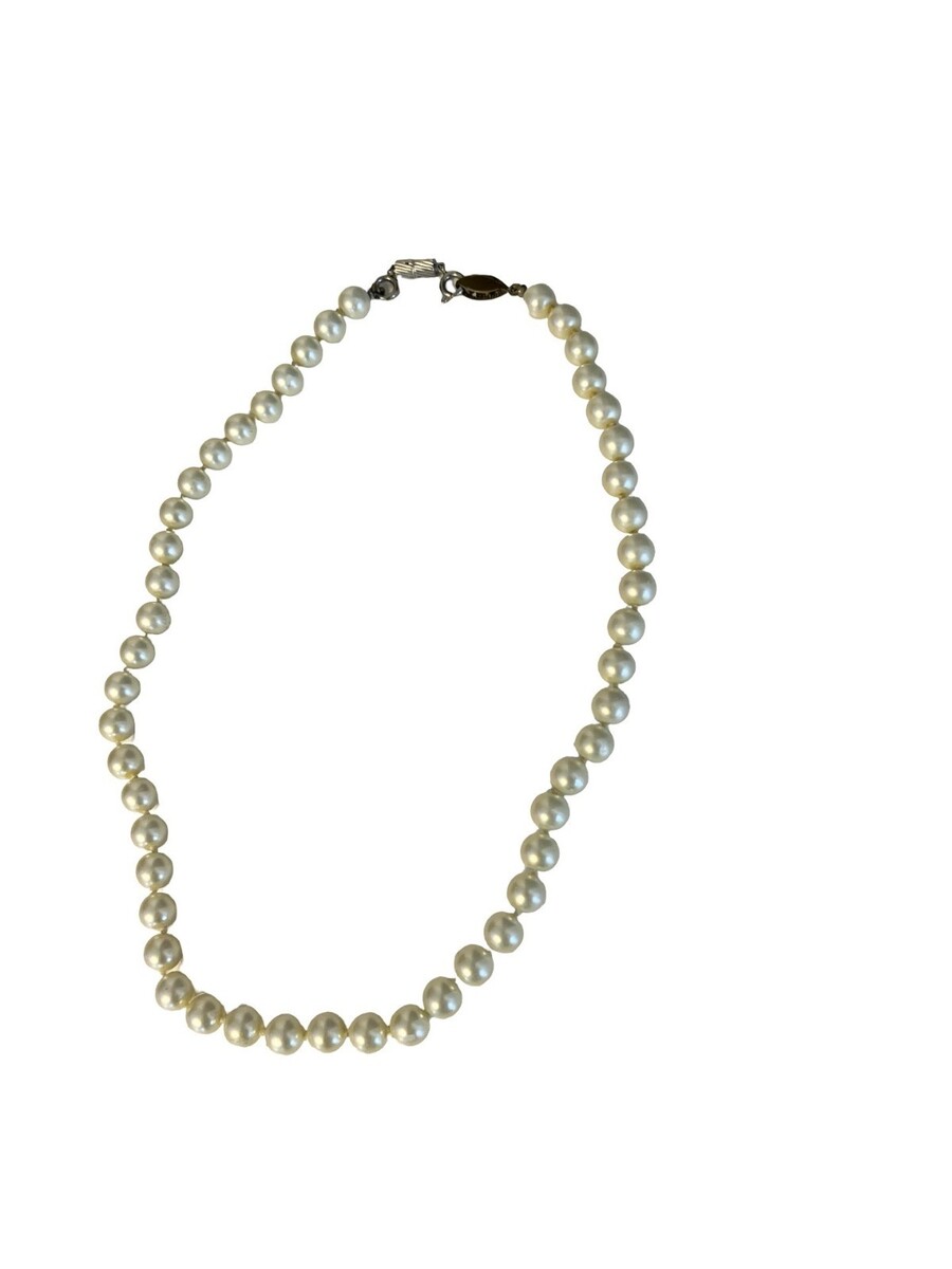 Elegant vintage freshwater pearl necklace featuring a single strand of creamy off-white pearls with beautiful natural luster. Each pearl is individually hand-knotted on silk thread, a traditional high-quality technique that protects the pearls and gives the strand a graceful drape.