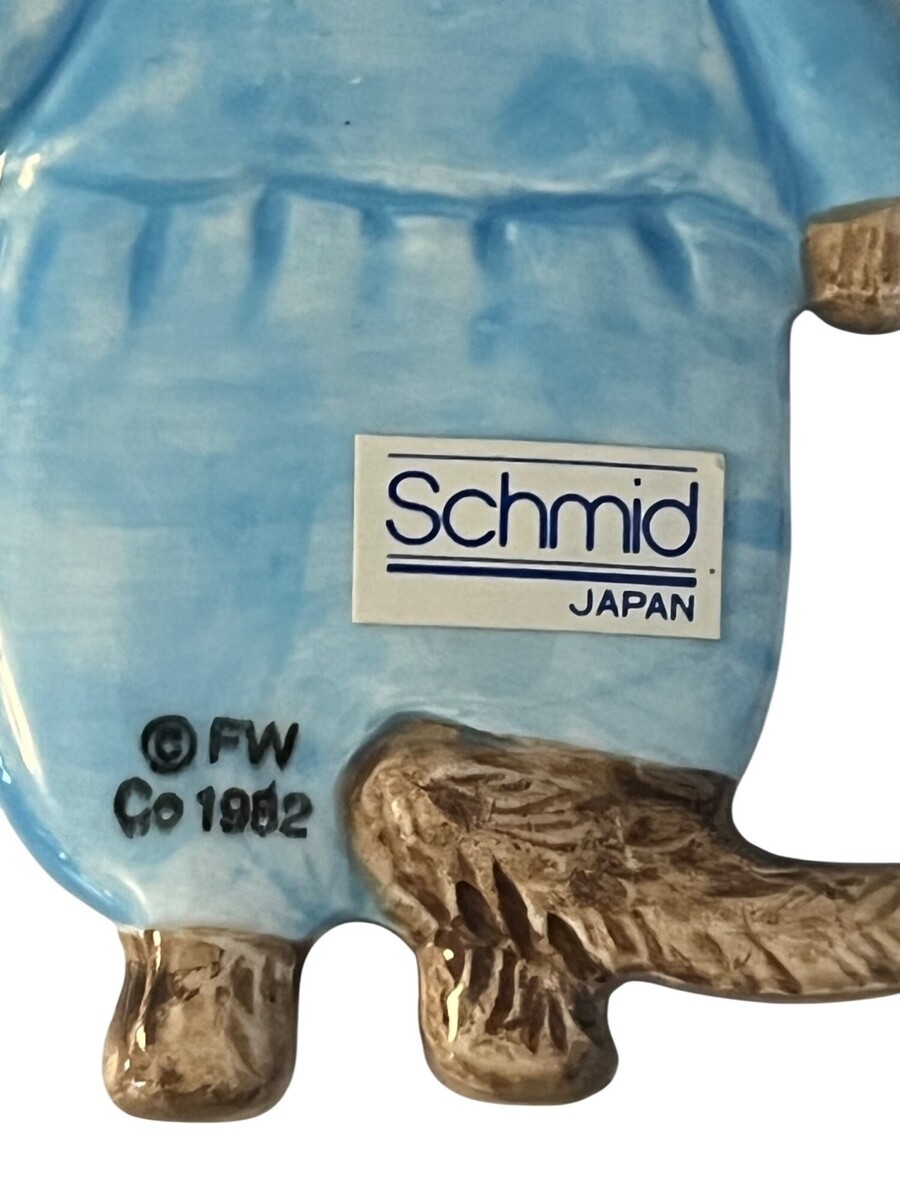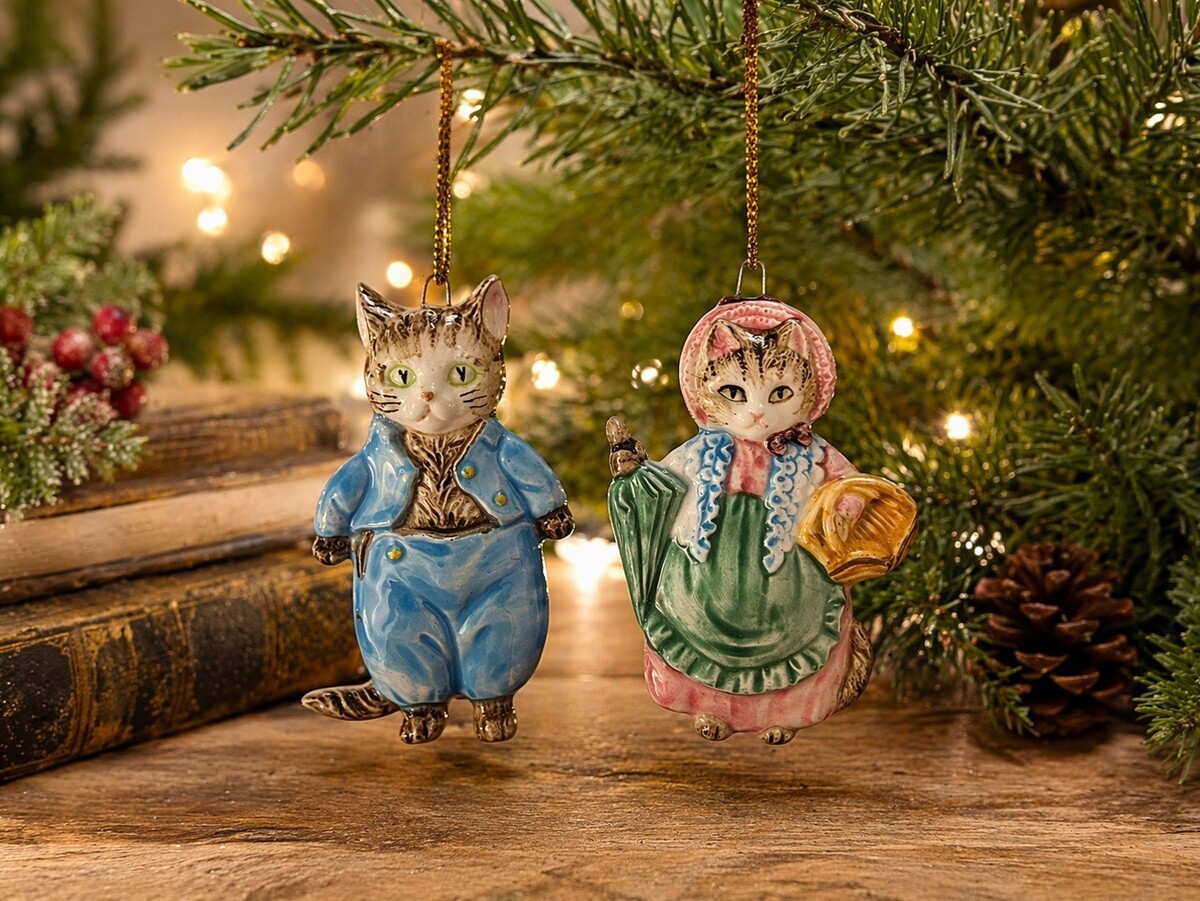 Charming set of two vintage ceramic cat ornaments by Schmid, made in Japan in 1982 1983. These adorable kittens are dressed in storybook-style clothing reminiscent of Beatrix Potter characters, complete with detailed outfits and expressive faces. One features a blue outfit, while the other wears a bonnet and carries a basket and umbrella. Both have a glossy ceramic finish and gold hanging cords. Perfect for Christmas trees, vintage decor displays, or collectors of Schmid and storybook-style figurines.