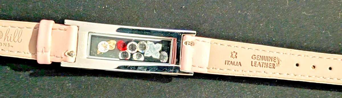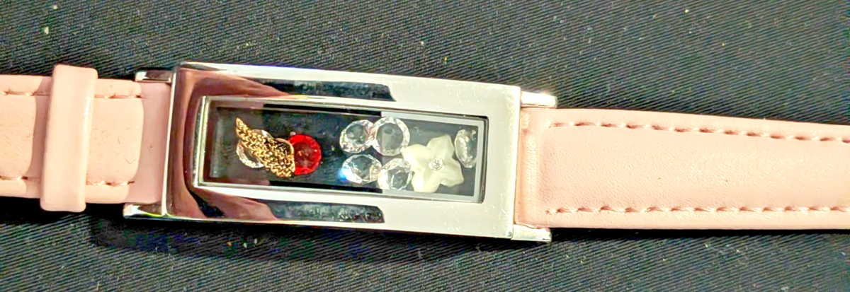 floating locket watch with pink leather strap