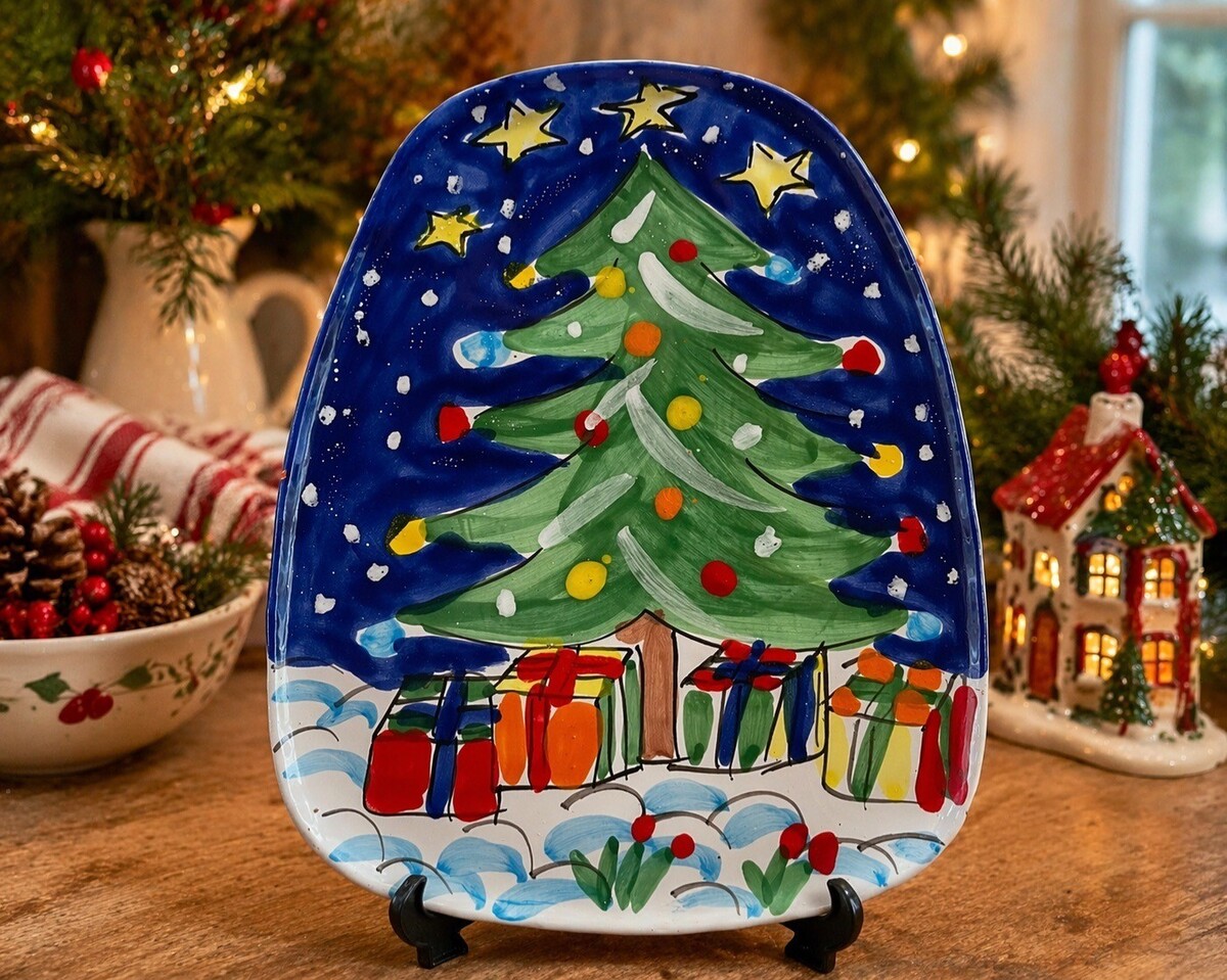 Charming vintage hand painted ceramic platter featuring a festive Christmas tree with colorful ornaments, stars, and wrapped presents. The bright, playful design and brushstroke details give it a warm, folk-art feel perfect for holiday decorating or serving.