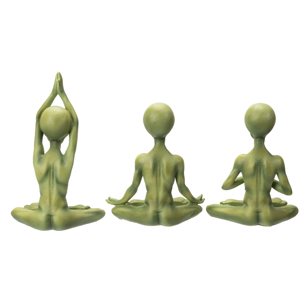 Yoga Poses figurines set of 3. Green Meditation Aliens in traditional yoga poses. Designed to spark conversation. This quirky piece brings a blend of sci-fi to your garden, patio, or home.