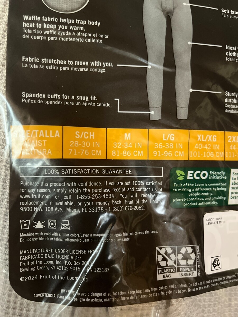 Fruit of the Loom Men’s Size M (32-34) Thermal Pants Waffle, Light Gray