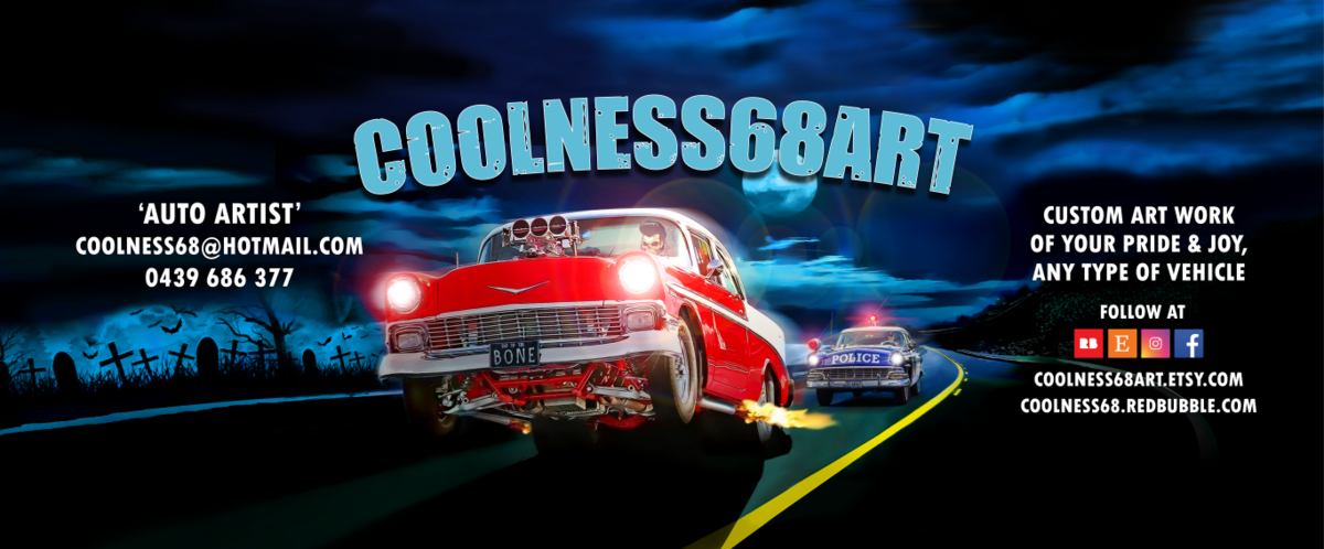 And there goes the Challenger, being chased by the blue, blue meanies on wheels. The vicious traffic squad cars are after our lone driver, the last American hero, the electric centaur, the, the demi-god, the super driver of the golden west! Printed on Professional Satin Photo paper - 260gsm. All care will be taken in the packing and shipping of your art print, put in a solid tube including tracking from Australia Post. For any commissioned work, please don't hesitate to contact me direct.
