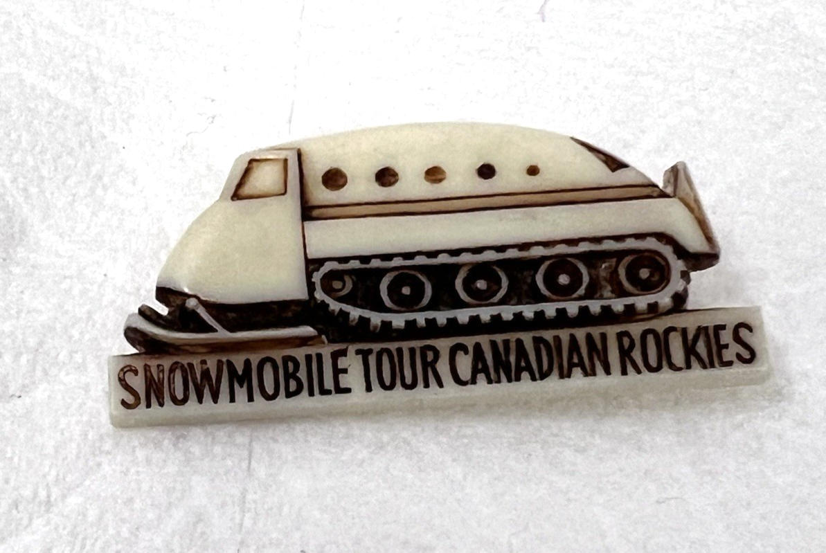 Vintage Snowmobile Tour Canadian Rockies Hard Plastic Brooch Pin Made in Austria in very good shape pin is working and the original tag is on the back 1 5/8 " x 3/4 inch