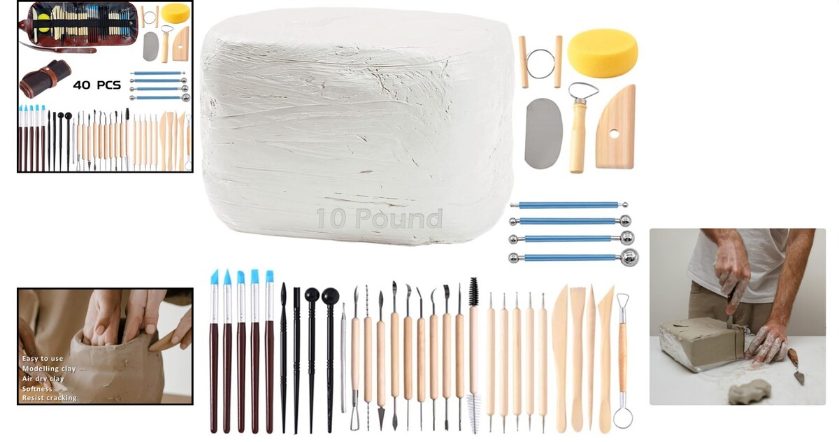Versatile 10LB White Clay with Complete 40 Piece Pottery Tool Set for Sculpting