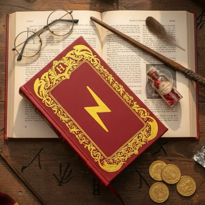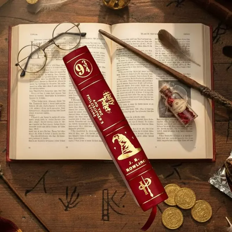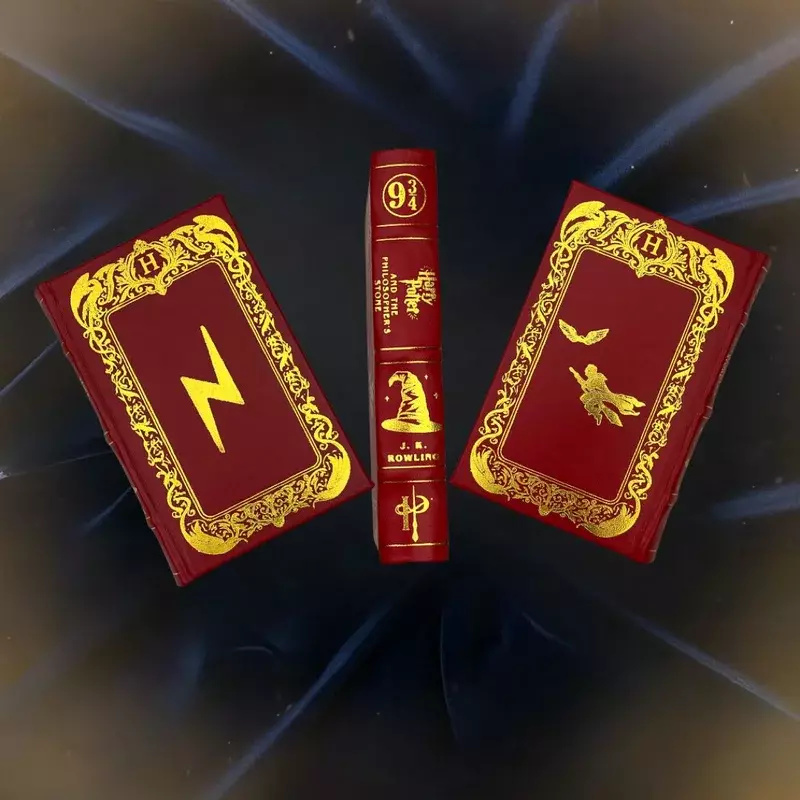 Rediscover the enchantment of a global classic with this handcrafted Premium Leather-Bound Edition of Harry Potter and the Philosopher’s Stone. The front cover displays the iconic lightning-bolt scar in radiant gold foil, surrounded by an ornate, vintage-inspired border that evokes the timeless charm of the wizarding world. The back features a striking gold-foil illustration of Harry in flight with Hedwig, paired with matching ornamental framing for a cohesive, magical aesthetic. Embellished spine details—including Platform 9, the Sorting Hat, the title, and J.K. Rowling’s name—shine in gold, complemented by raised spine bands and a rich red ribbon bookmark. Beyond its luxurious presentation, this edition honors the story that started it all. The book follows young Harry Potter, who discovers on his eleventh birthday that he is a wizard and is invited to attend Hogwarts School of Witchcraft and Wizardry. As he enters a world filled with spells, mysteries, and new friendships, Harry uncovers the truth about his parents and the dark wizard who shattered his past. Alongside Ron Weasley and Hermione Granger, he unravels the secrets surrounding the Philosopher’s Stone, facing danger, wonder, and destiny. Perfect for collectors and devoted fans, this edition brings the magic of Harry’s first adventure to life in a keepsake built to last.