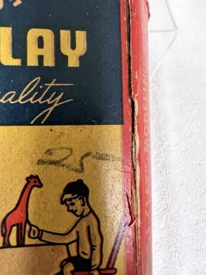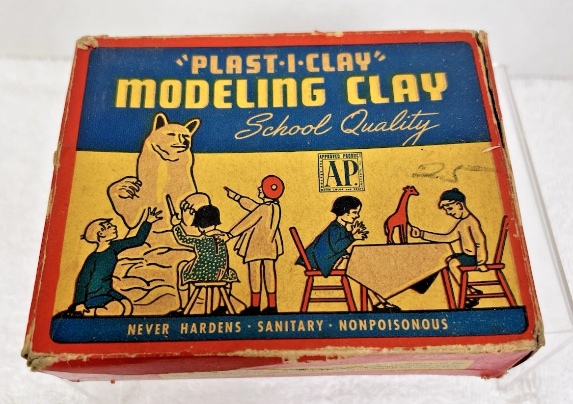 Vintage American Art Modeling Clay Children Bear Figure Original Box No 7K. Very cute colorful cover to Plast-I-Clay American Art Clay Company Indiana with children modeling clay into a giraffe a large bear like critter, clay appears to be in original packaging unused. Box measures approx. 5" long, 4" wide, 1 1/8" tall/deep and is in overall good condition, some tearing to edges, creases. Original 25 cents in grease pencil on front. See pictures.