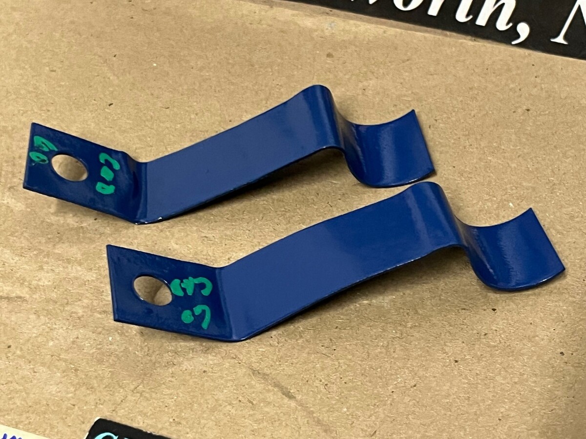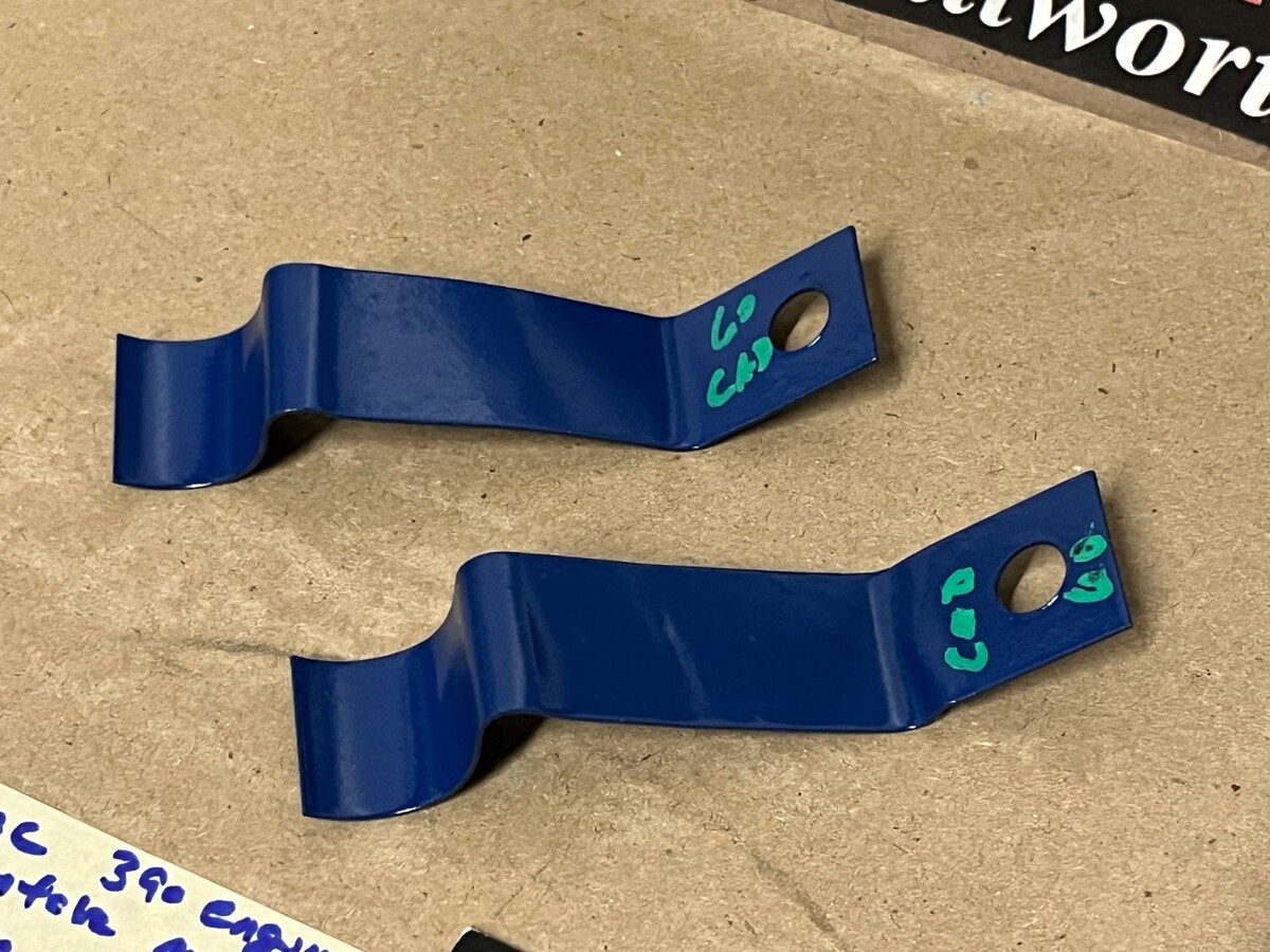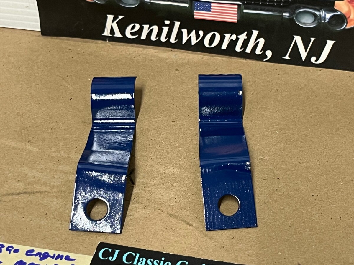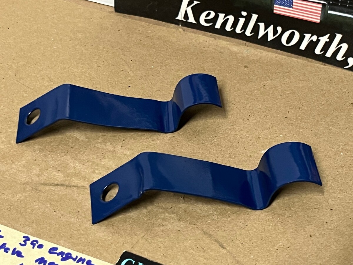 This Restored pair of heater hose retaining brackets mounted under the intake manifold on the 390 engines. These brackets have been sandblasted and painted dark blue, and are in very good condition for their age. Please view all pictures as they are a part of the