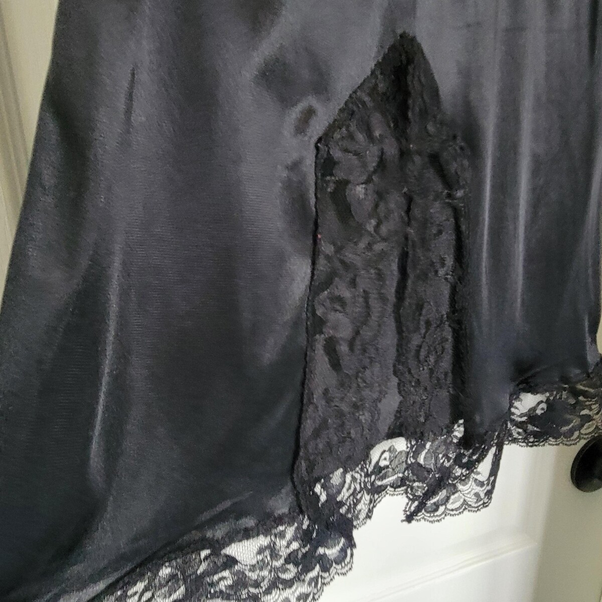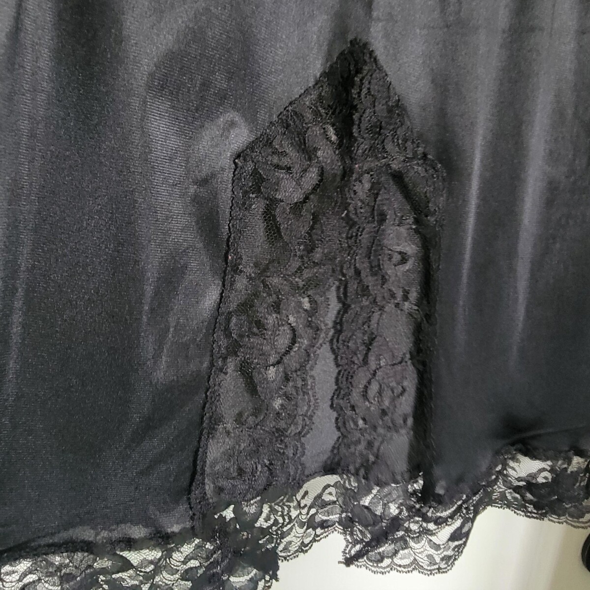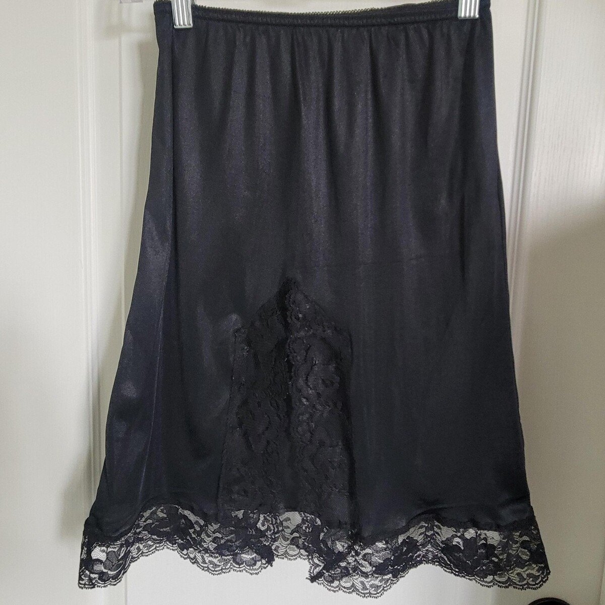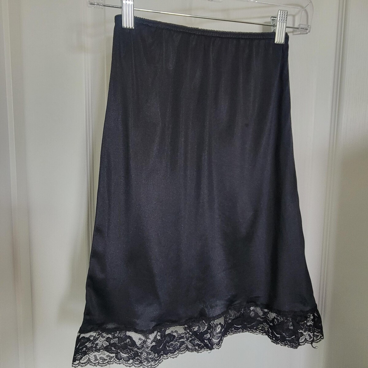 MEL-LIN Size Small Black Silky Nylon Half Slip Skirt Lace Trim Back Slit EUC