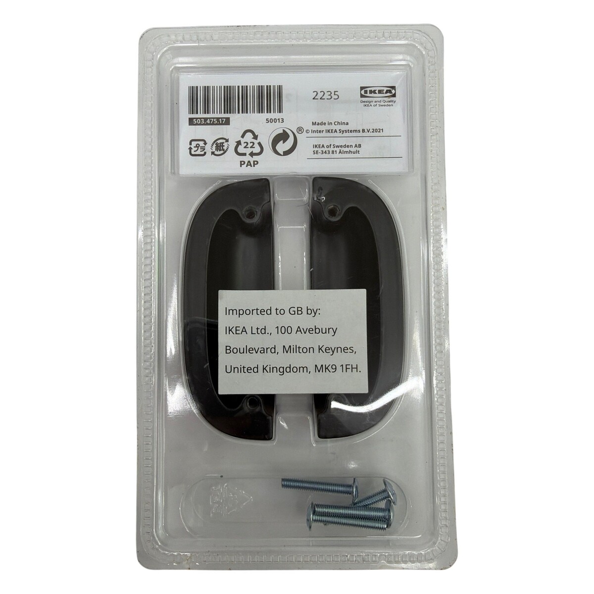 New IKEA ENERYDA black cup cabinet pulls, 89 mm (3 1/2") length with 64 mm (2 1/2") center-to-center hole spacing, article number 503.475.17. Set includes two handles and mounting screws as shown. Factory packaging is unopened and may show minor shelf wear to the plastic, but the handles themselves appear unused.