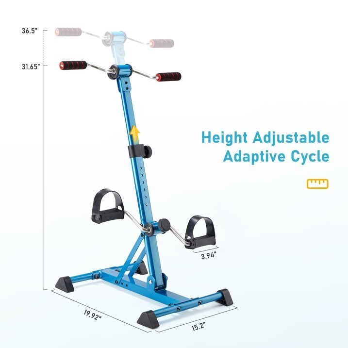 ?Adjustable Adaptive Cycle?This adaptive cycle - upper and lower limb rehabilitation machine has adjustable height and angle to let you work arms and legs for safe, low-impact exercise all from your comfort chair or sofa. With 6 grades, the height can be adjusted from 31.65" to 36.5" to meet the needs of different people.