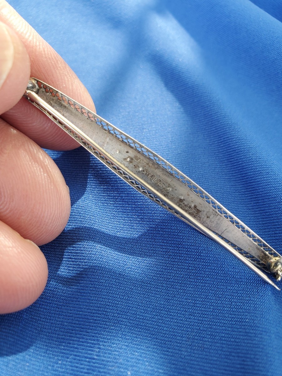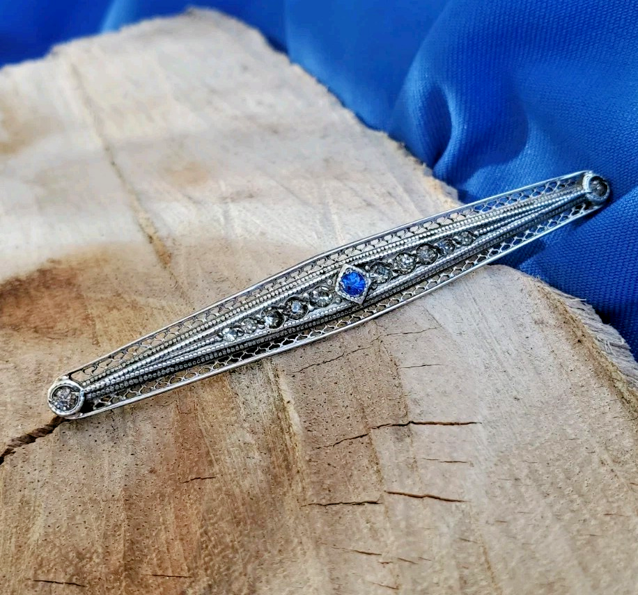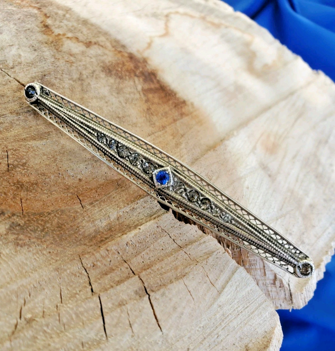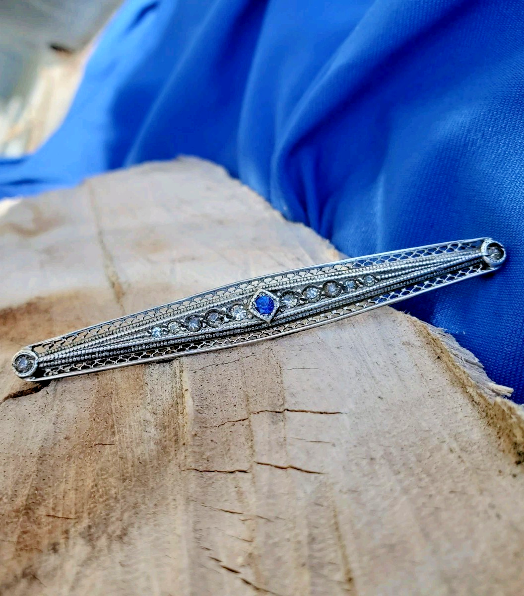 Unique original deco bar pin with blue sapphire paste center and clear paste on sterling silver filigree.