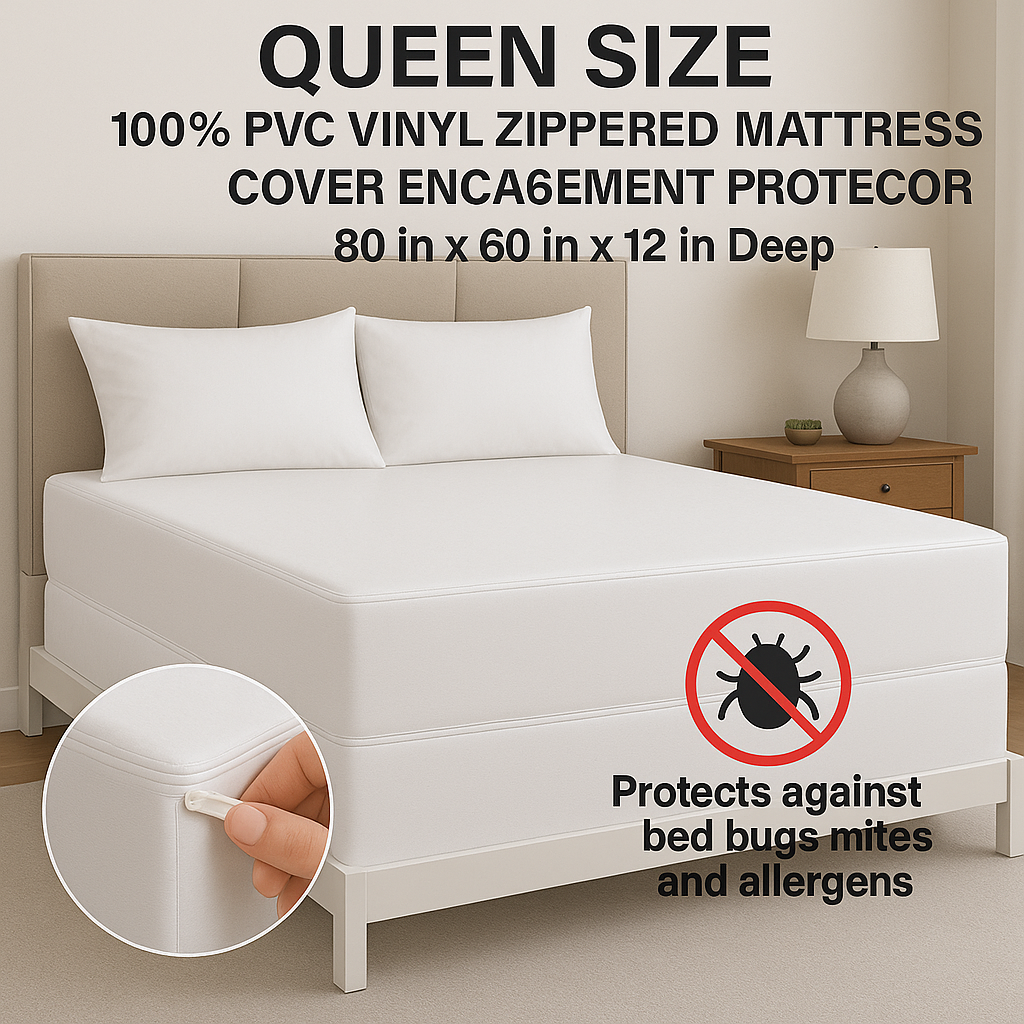 Shield your investment with this premium-quality queen-size zippered mattress cover. Made from 100% heavy gauge PVC vinyl, this cover is thicker and more durable than most on the market. Designed to protect against spills, stains, allergens, bed bugs, and dust mites, it?s ideal for home, rental properties, dorms, or long-term storage.