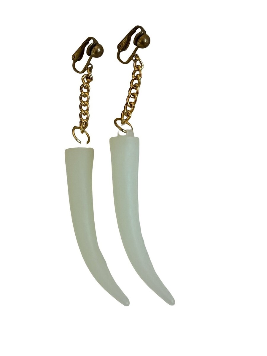 Vintage Glow in the Dark Dangle Earrings Cream Fang Drop Clip On 4 Inch