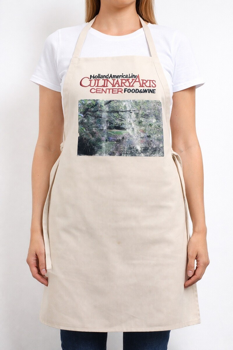 Official Holland America Line Culinary Arts Center apron featuring embroidered logo and scenic graphic panel. This is a great souvenir or functional kitchen apron for cooking, baking, or entertaining. Neutral beige color makes it versatile for everyday use or display.