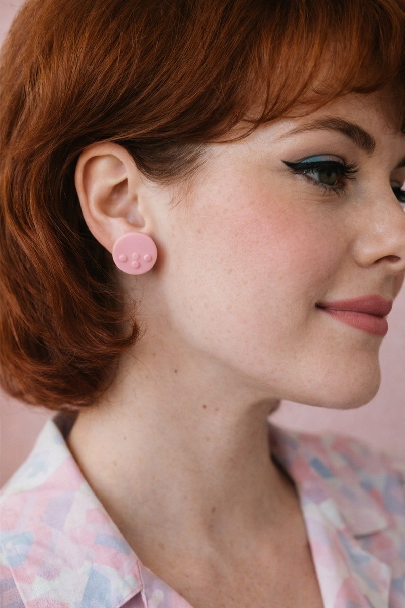 Charming vintage pink stud earrings featuring a classic button shape with raised dot detailing. Simple yet playful, these have a soft retro aesthetic that pairs well with both minimalist and vintage-inspired styles.