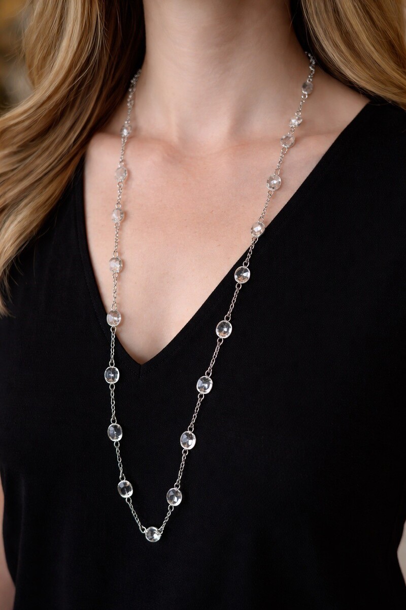 Vintage Clear Glass Station Necklace 32” Silver Tone Chain Faceted Crystal Bezel