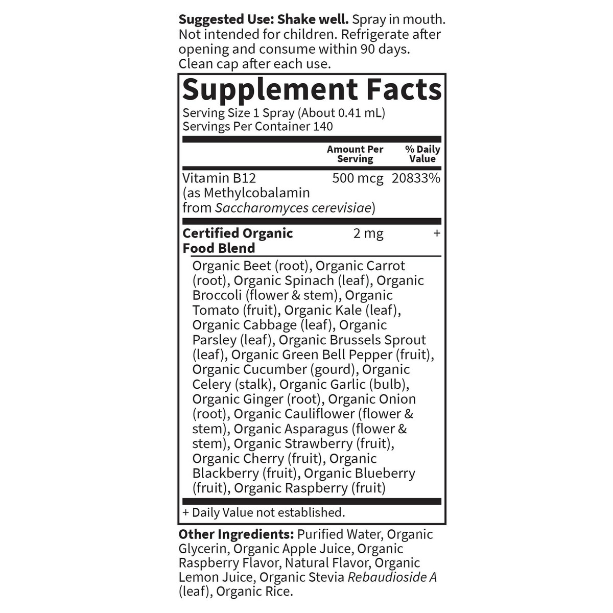 Expiration Date of 5/2026 ? B12 VITAMIN SPRAY: One serving of 2 oz delivers 500mcg vegan methylcobalamin (8333% DV) B12 to support energy metabolism and heart health* ? B12 VITAMIN LIQUID FORMULA: Garden of Life liquid vitamin features 500mcg methylcobalamin?the active form of vitamin B12 found in your body for maximum effectiveness ? HEART HEALTH METABOLISM: This vitamin B12 spray supports energy metabolism, heart health, and a healthy central nervous system* ? CLEAN CERTIFIED: USDA Organic, Non-GMO Project Verified, Vegan, Gluten-Free, Kosher, no artificial colors or preservatives ? EASY DAILY SUPPORT: Take 1 convenient spray daily and swallow; delicious raspberry flavored vitamin spray delivers concentrated B12 for energy metabolism support throughout the day*