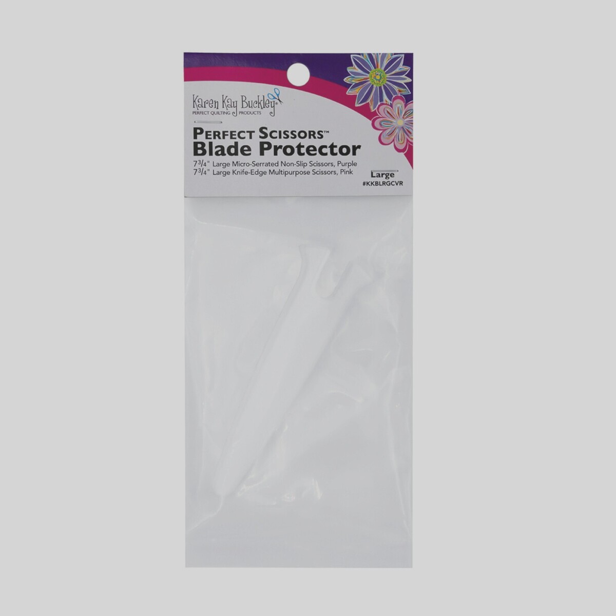 Karen Kay Buckley Replacement Blade Protector for Large Scissors. Replacement blade protector for large Karen Kay Buckley scissors. Keep the tips of your scissors safe by storing them in a protective cover when not in use. This Blade Protector is compatible with: 7-3/4 inch Large Micro-Serrated Non-Slip Scissors, Purple #KKBPSL and 7-3/4 Inch Large Knife-Edge Multipurpose Scissors, Pink #KKB207. Safeguard your Perfect Scissors, ensuring the blades remain in top condition when not in use. Snaps in place and stays put. CHK-KKBLRGCVR