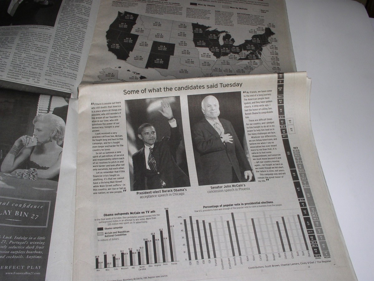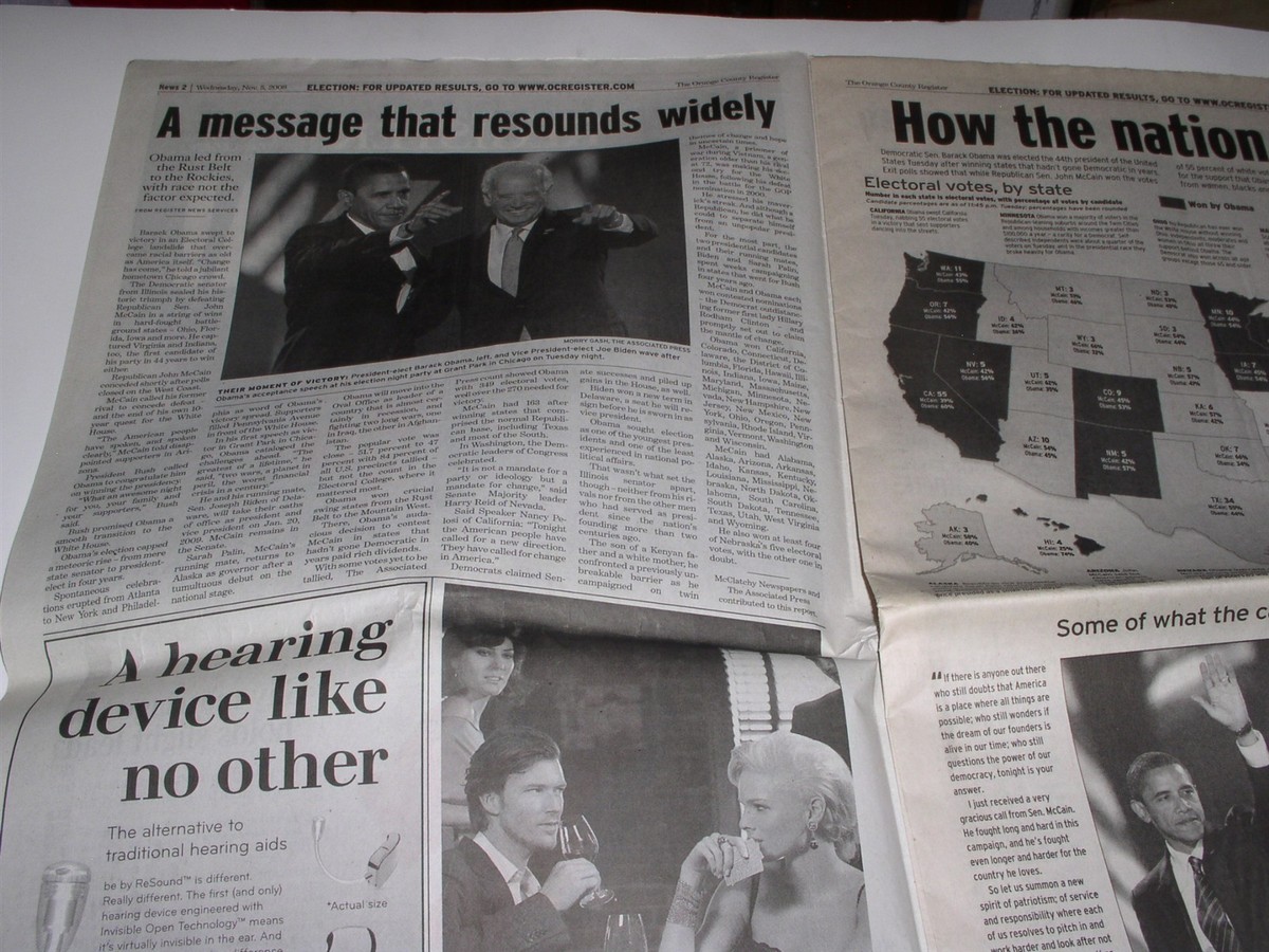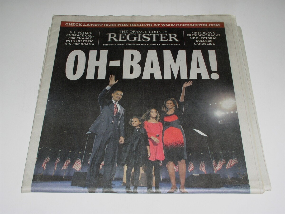 This is the November 5, 2008 issue of the election of President Barack Obama from the Orange County Register, California. Cover story on President Barack Obama. A great item for the fan or collector.