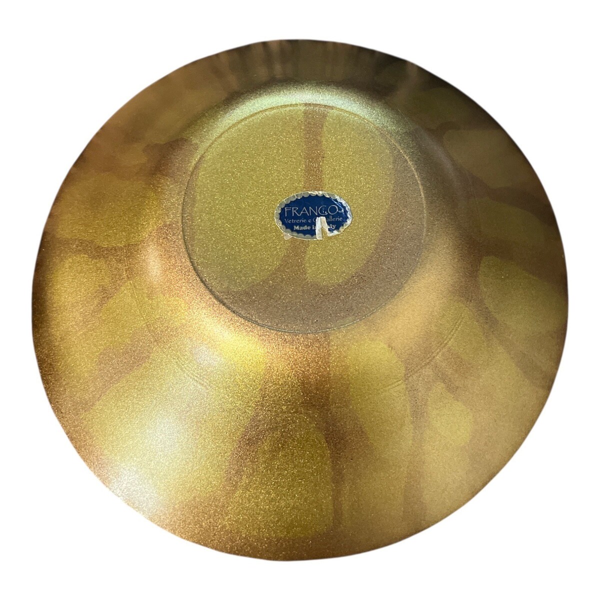 Italian art glass bowl by Franco featuring a rich amber and gold swirl with shimmering aventurine throughout. The piece has a low, wide form with a sculpted center well, giving it a striking centerpiece presence. Original Franco label remains on the base, confirming Italian origin.