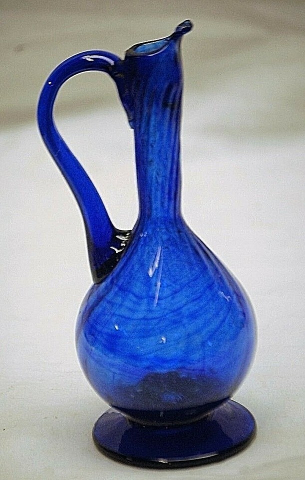 Cobalt Blue Art Glass Oil Vinegar Cruet Long Neck Swirl Footed Hand Blown Vntage