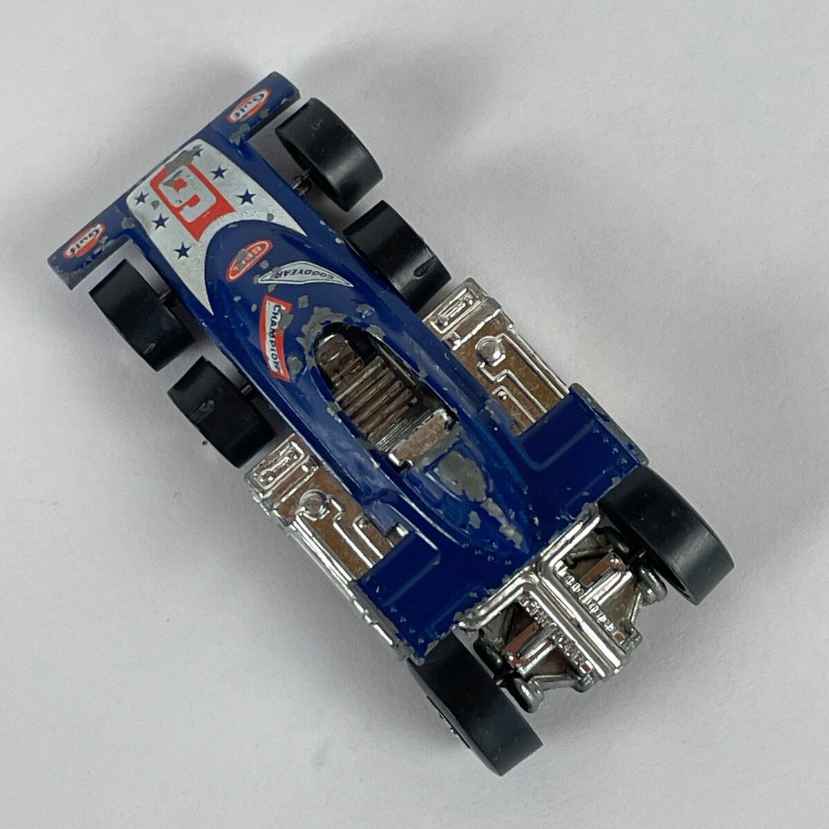 Detailed sponsor decals such as CHAMPION, GOODYEAR, ELF, BELL, and GULF enhance its authentic racing appeal. The model showcases intricate chrome-plated engine details and a sleek open cockpit, capturing the essence of a classic race car. Crafted with a durable diecast metal body and a plastic chassis, this Hot Wheels Lickety Six is a prized piece for enthusiasts of vintage diecast cars, especially those seeking rare and innovative designs from the golden era of Mattel's Hot Wheels.