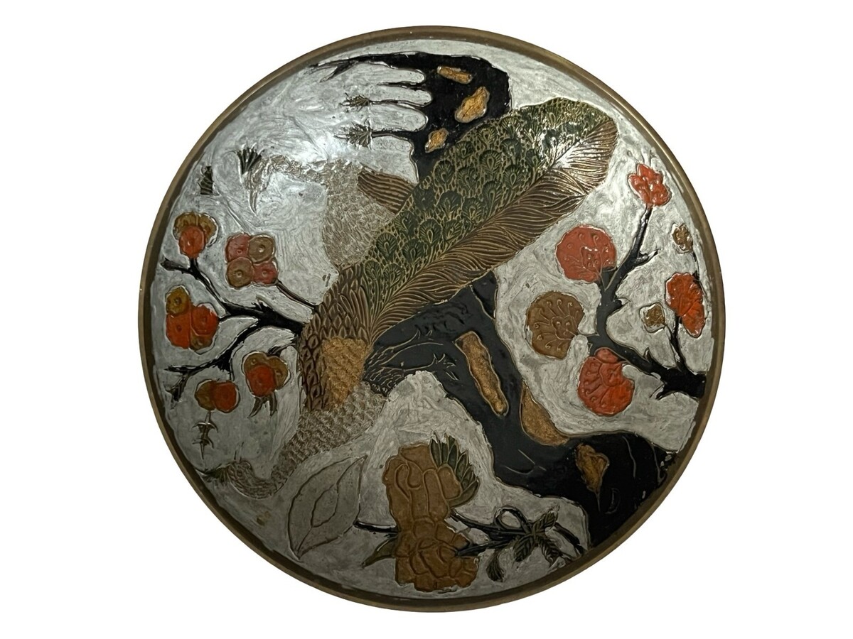 Vintage Hampton Brass decorative bowl featuring a detailed raised relief design with a peacock and floral motif. The interior has a textured and hand finished look with contrasting tones including gold, black, and red accents.