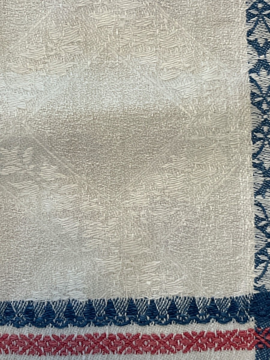 The center has a subtle woven geometric pattern, while the borders feature more detailed stitching in a classic Americana color palette. Lightweight and absorbent, this piece functions as a kitchen or tea towel and also displays beautifully.