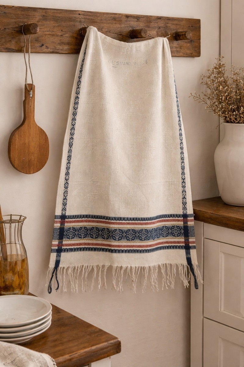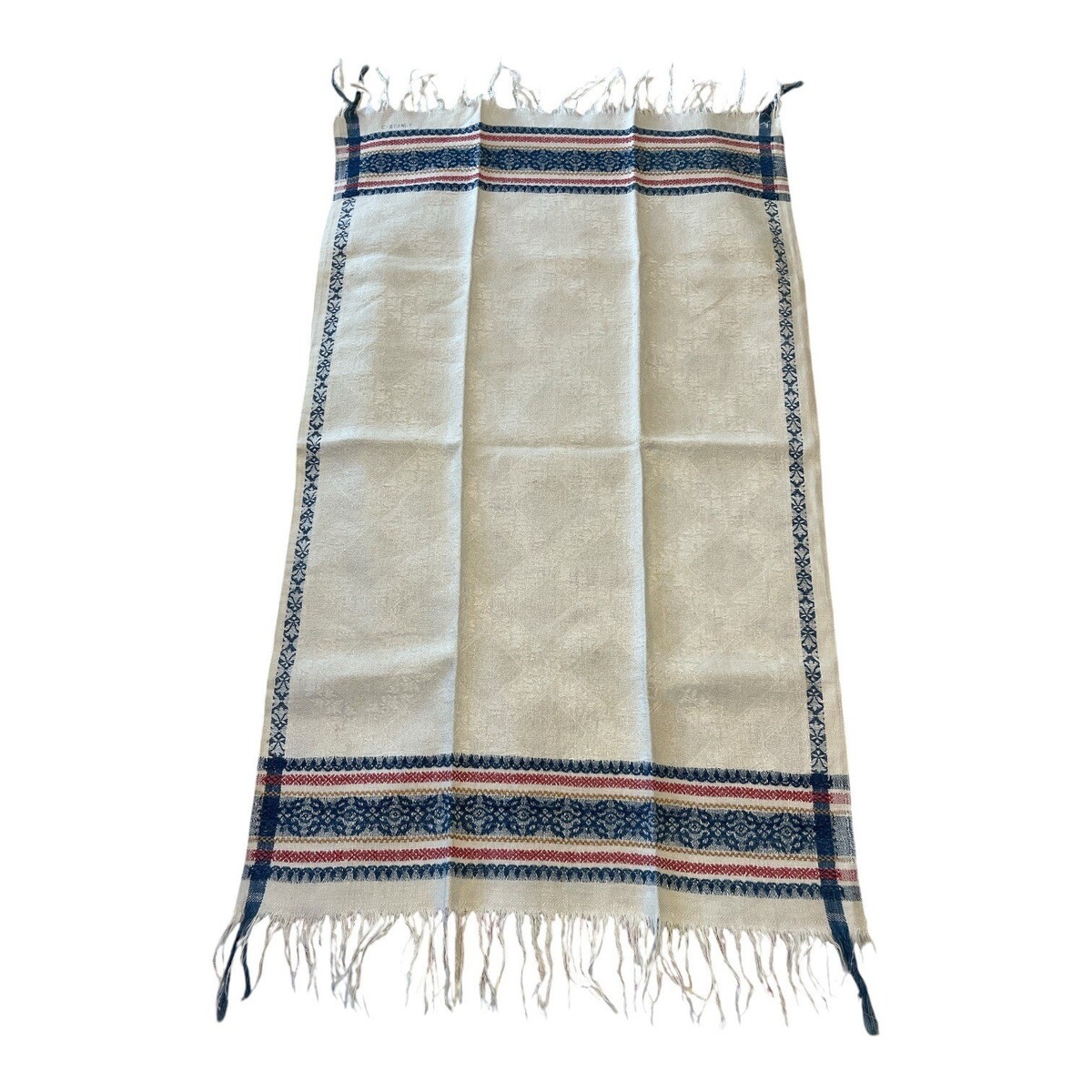 Vintage woven kitchen towel featuring a cream base with red and blue decorative stripe borders and fringe at both ends.
