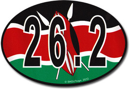Marathondecals feature a waving Kenyaflag in the background andmeasure3" x 4.5". Theoval decals are printed on vinyl using UV resistant inks that won't run in even the most extreme weather conditions.